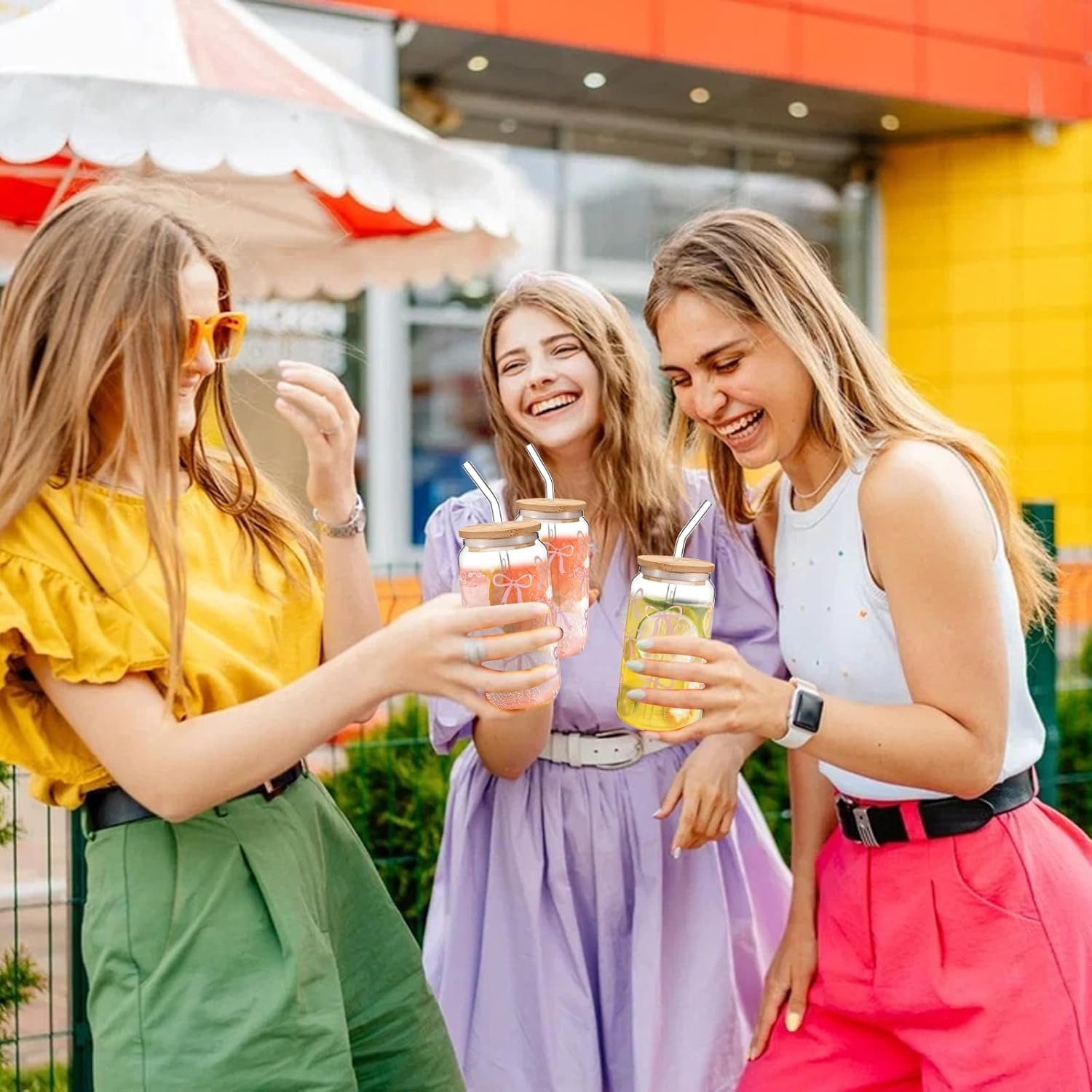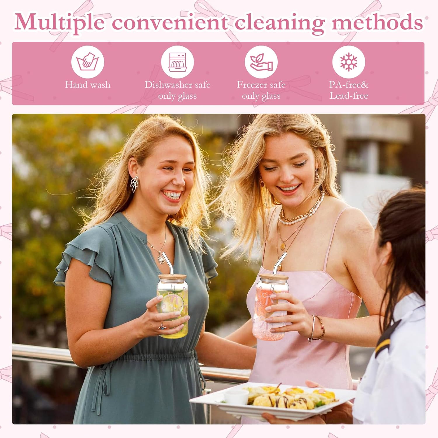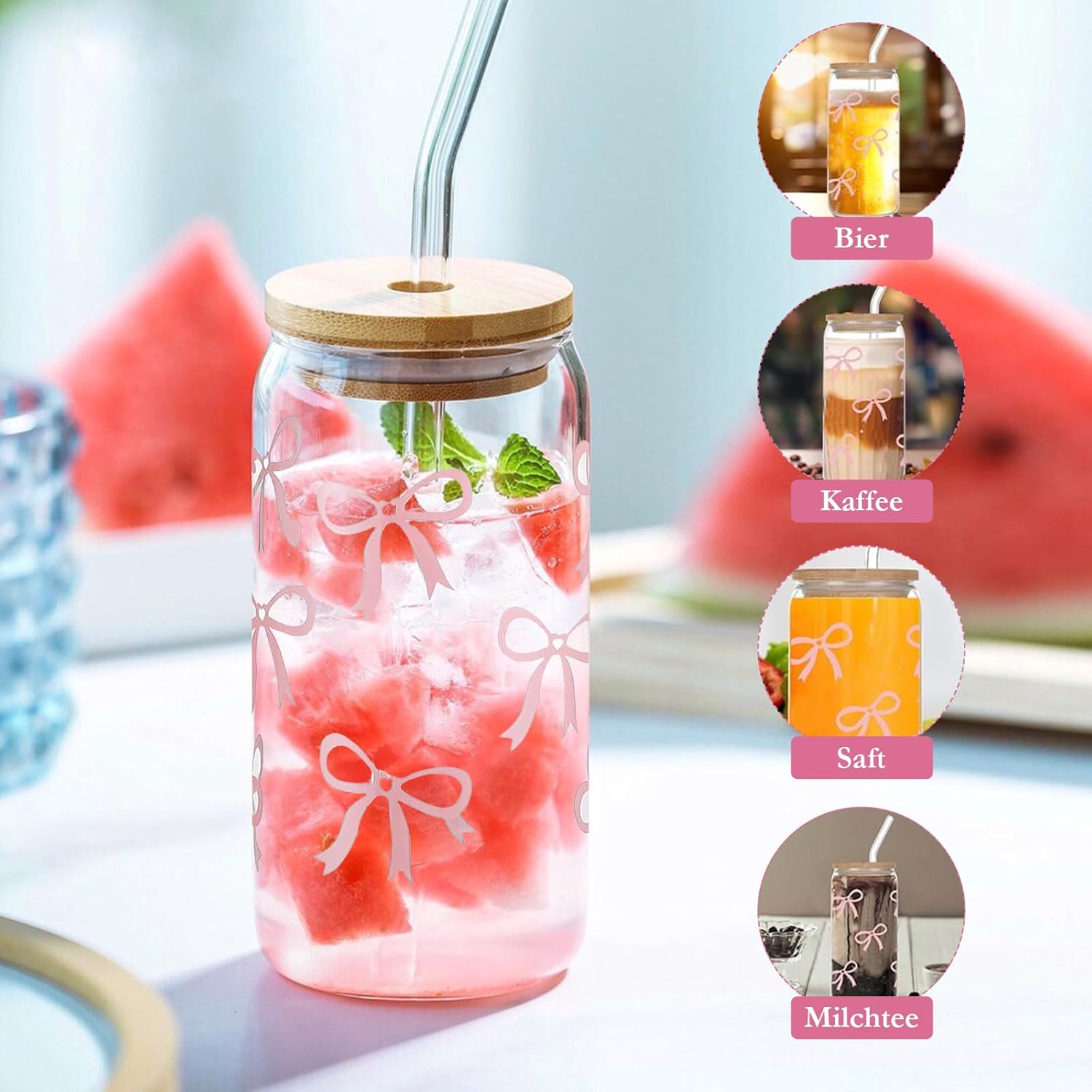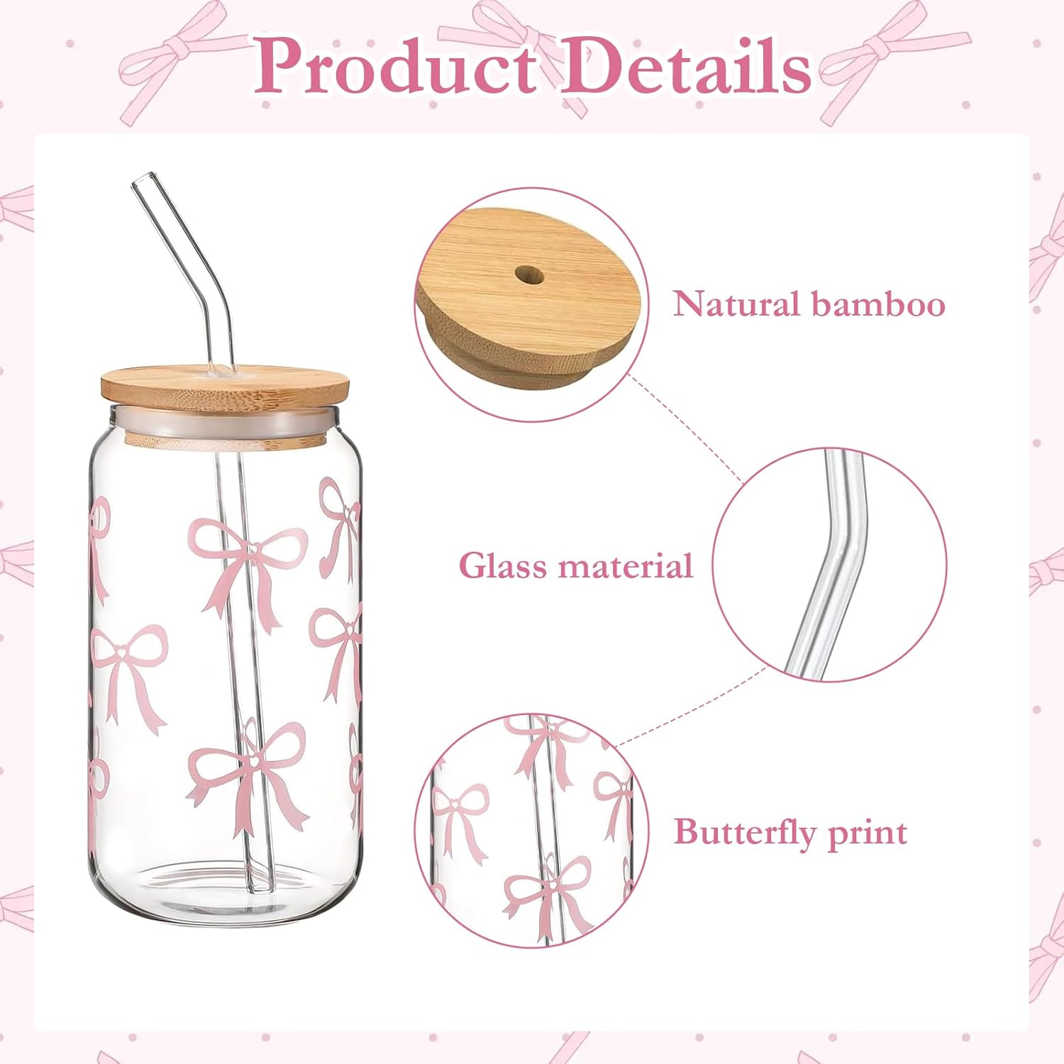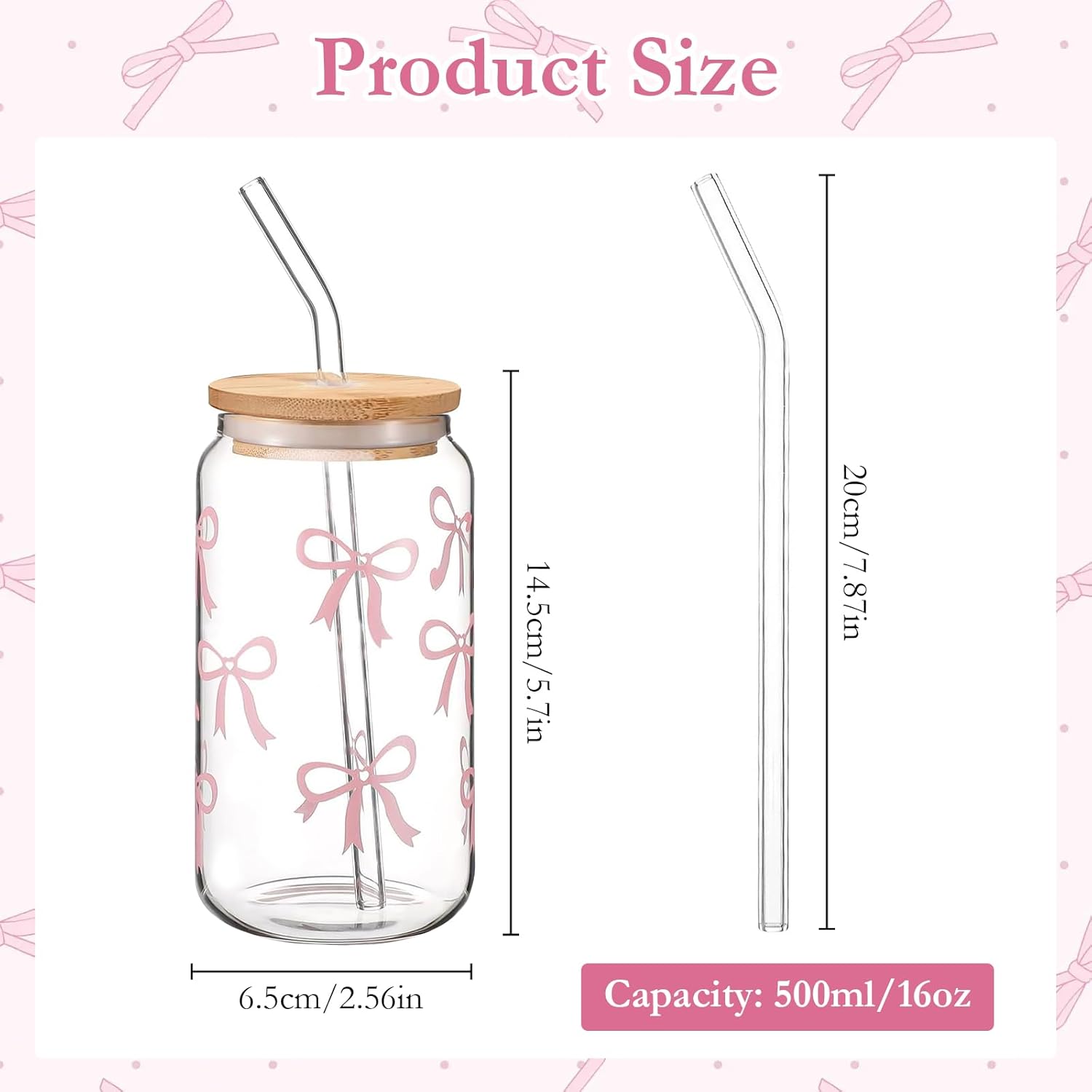 Стъклена чаша за пиене с капак и сламка, стъклена чаша с панделка 16 oz, стъклена кутия за ледено кафе, розова стъклена чаша с панделка, многофункционална чаша за балон чай, кафе (модел с панделка)