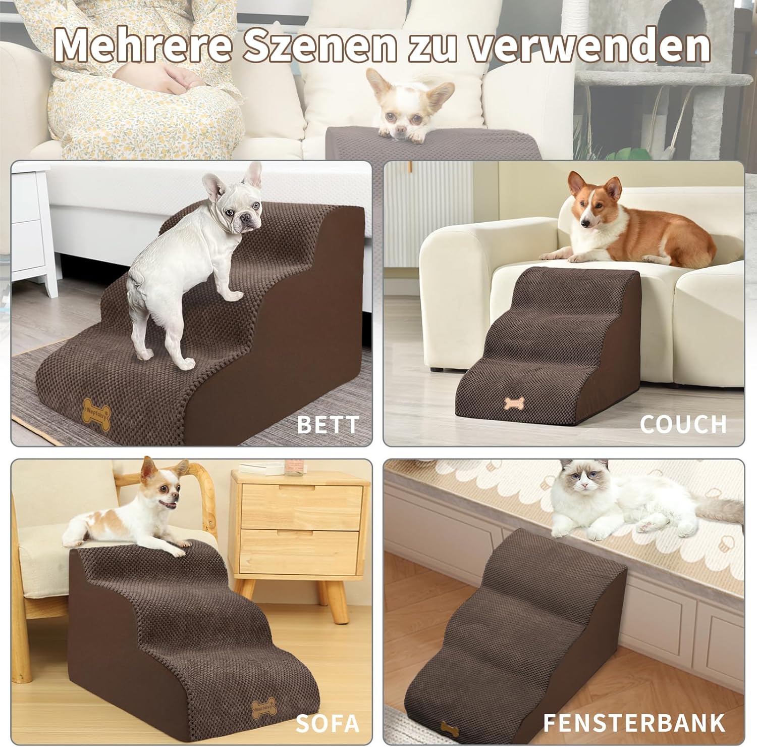 • СТЪЛБИ ЗА МАЛКИ КУЧЕТА: Тези стълби за кучета позволяват на кучето да достига по-високо и да се катери без усилие по високи легла или дивани без ваша помощ, намалявайки риска от скачане и по-добре предпазвайки ставите. Идеални са за малки кучета или кучета с къси крака, като дакели, коргита или по-възрастни кучета с двигателни проблеми. Осигурете на вашия домашен любимец по-лека и безопасна среда за катерене.