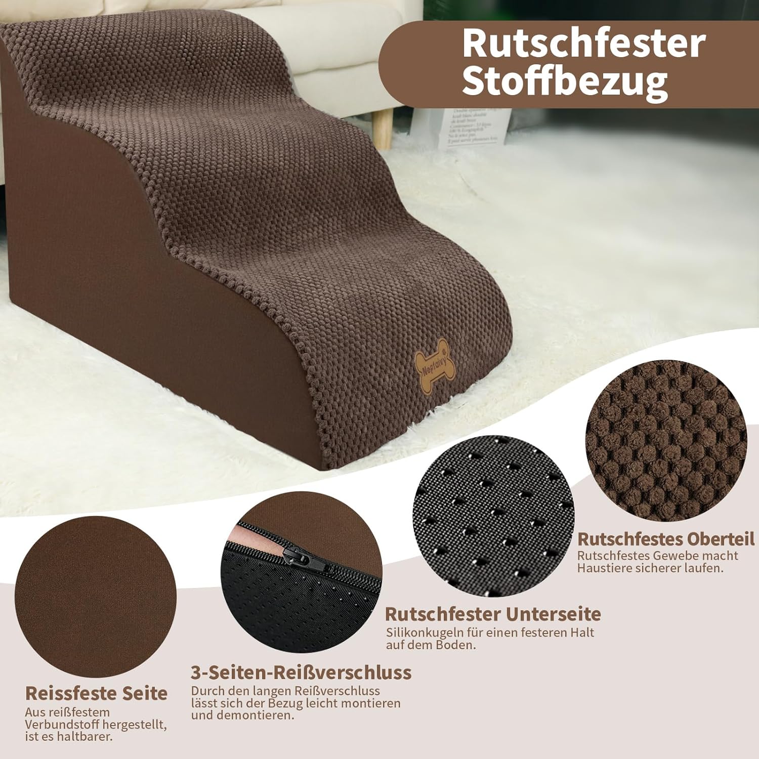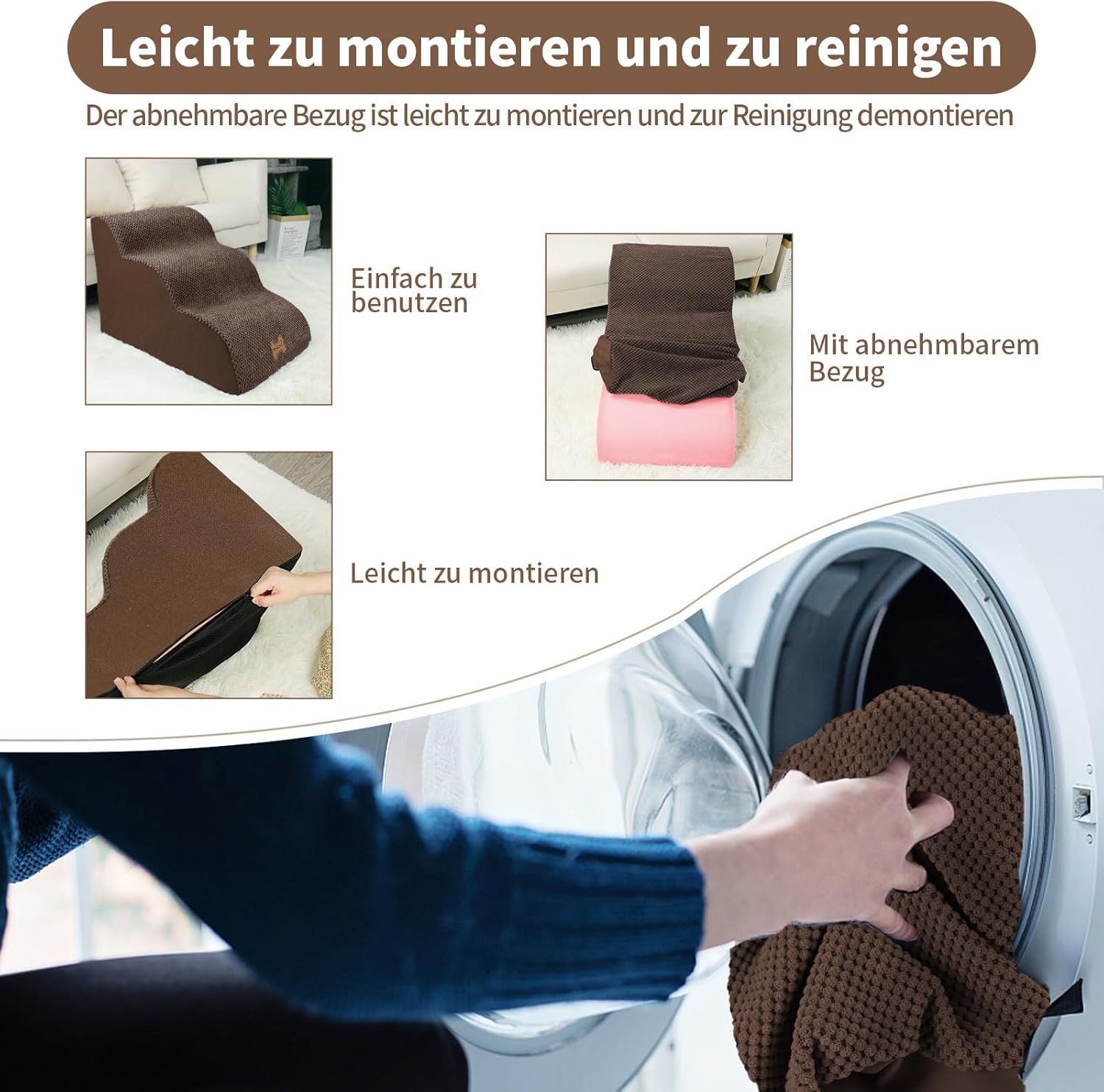 • НЕРЪЗГАЩИ СЕ И МИЕЩИ СЕ СТЪПАЛА ЗА КУЧЕТА: Повърхността на стълбите за кучета е от оребрена кордова материя, която е неплъзгаща се, има по-добро сцепление и е по-добра за захващане от лапите на вашето куче. Неплъзгащите се гранули на дъното правят цялото стълбище за кучета много стабилно и кучето ви може да се катери по-плавно и безопасно. Освен това, покритието на стълбите за кучета има ципове от трите страни, което улеснява монтажа и демонтажа за почистване.