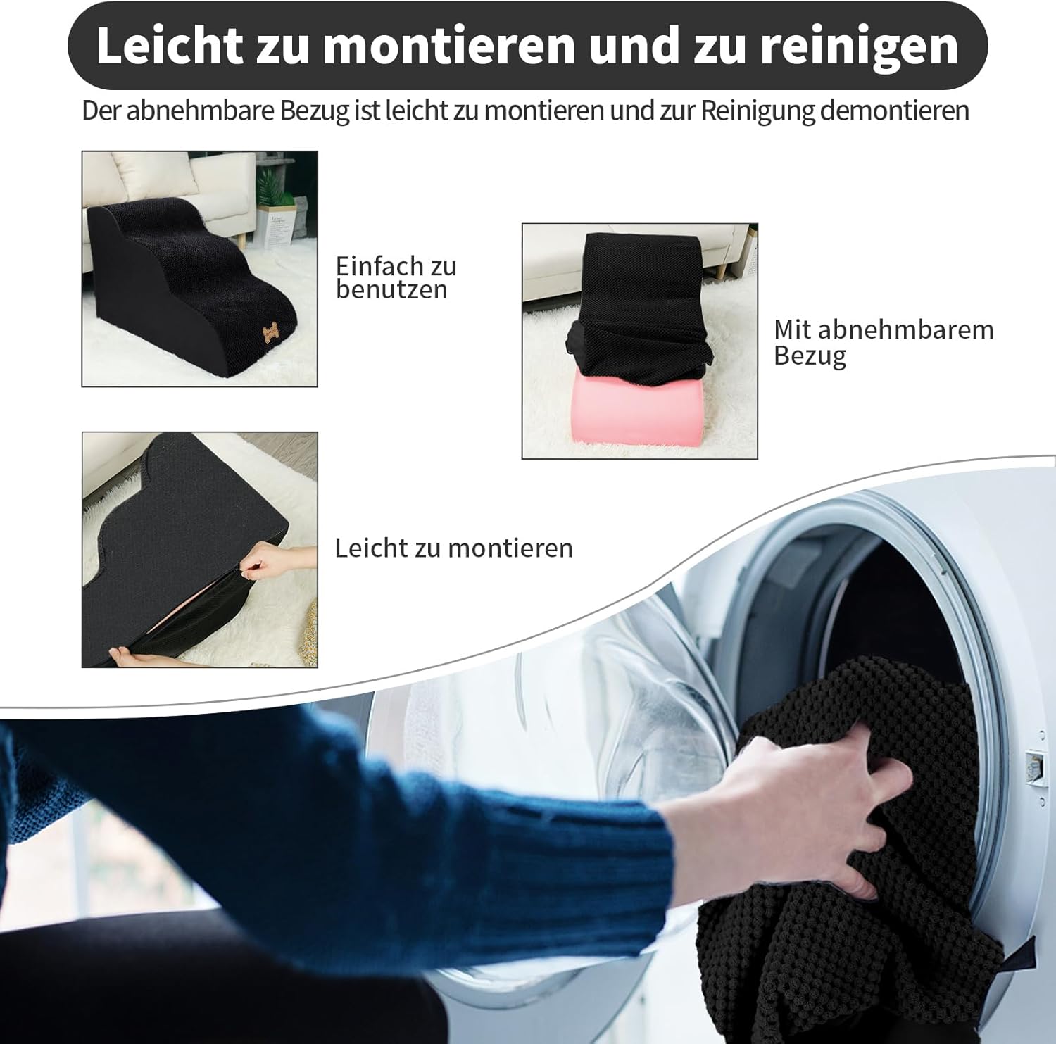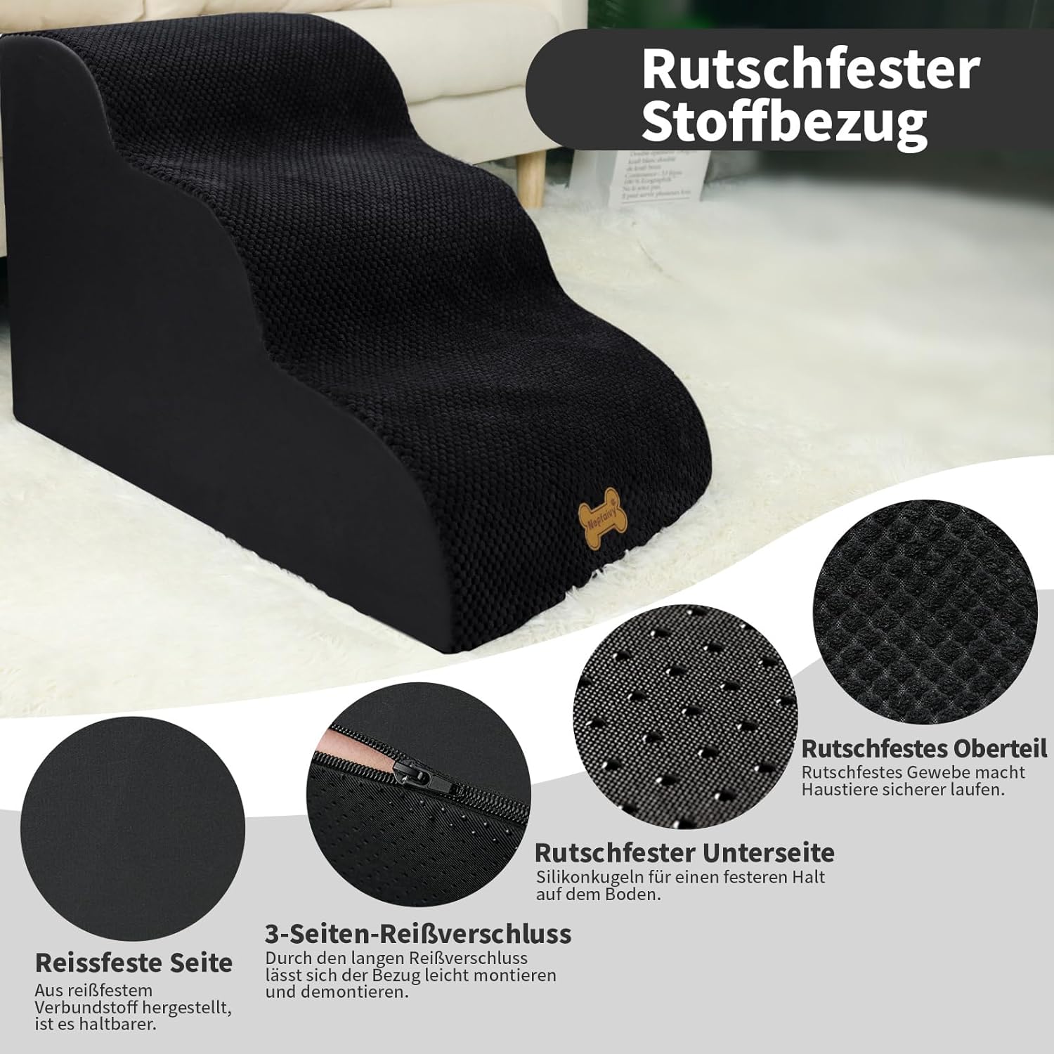 • НЕРЪЗГАЩИ СЕ И МИЕЩИ СЕ СТЪПАЛА ЗА КУЧЕТА: Повърхността на стълбите за кучета е от оребрена кордова материя, която е неплъзгаща се, има по-добро сцепление и е по-добра за захващане от лапите на вашето куче. Неплъзгащите се гранули на дъното правят цялото стълбище за кучета много стабилно и кучето ви може да се катери по-плавно и безопасно. Освен това, покритието на стълбите за кучета има ципове от трите страни, което улеснява монтажа и демонтажа за почистване.