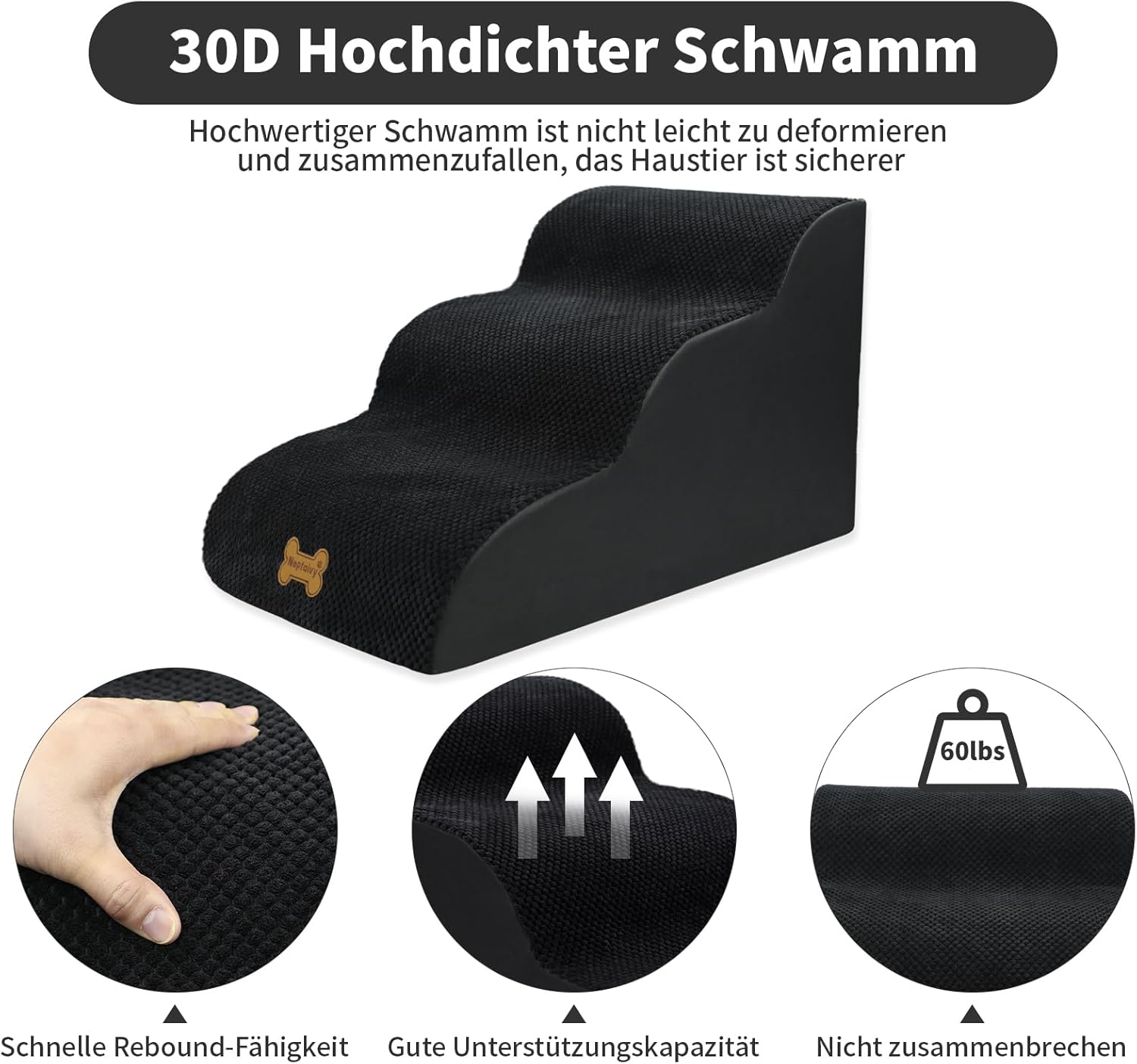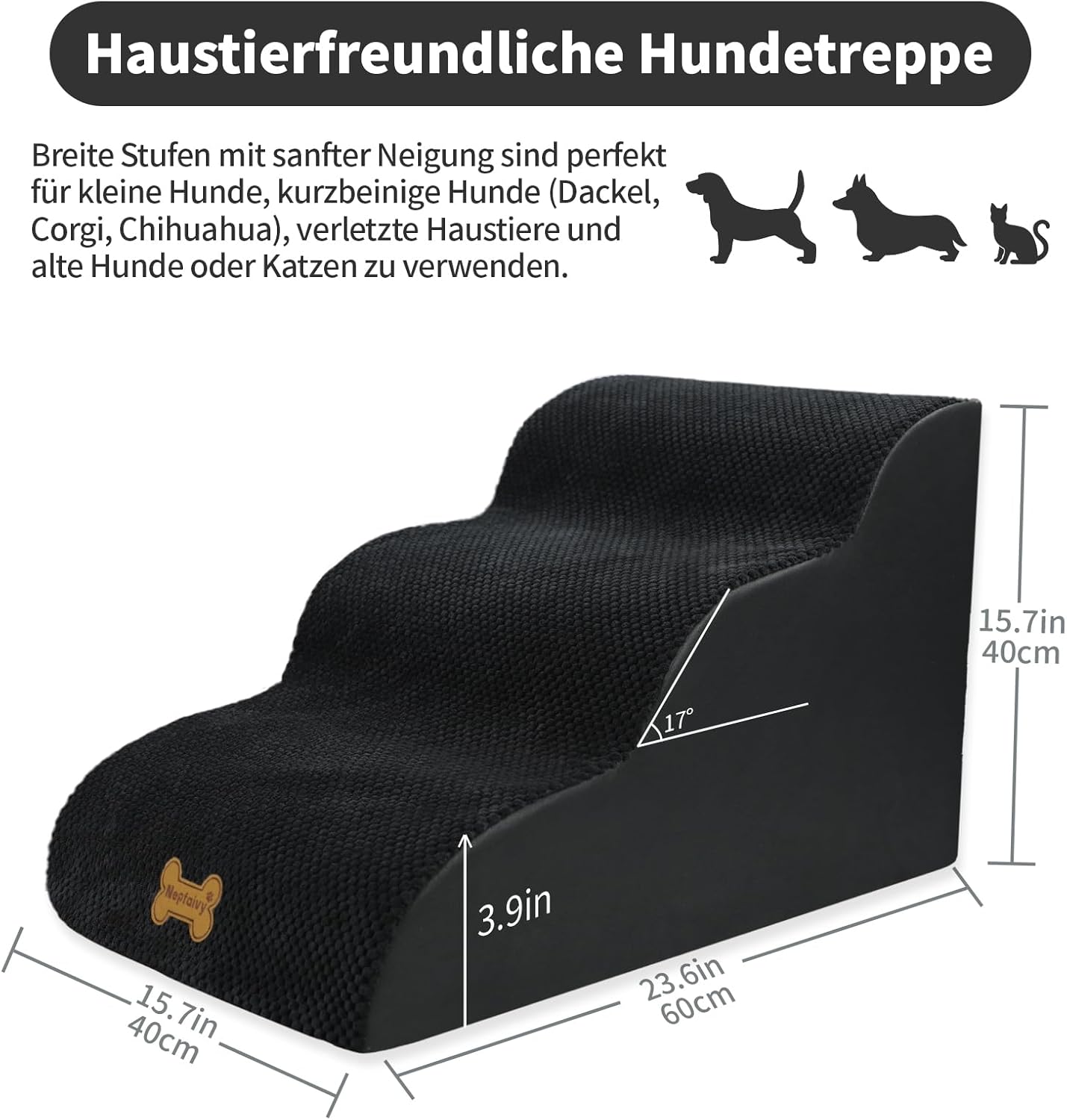 Стълби за кучета Nepfaivy за малки кучета, 3 нива, стълби за домашни любимци за легло и диван, изработени от гъба с висока плътност, стълби за кучета, рампа за кучета със сваляем, миещ се калъф и нехлъзгаща се основа, 60 x 40 x 40 см