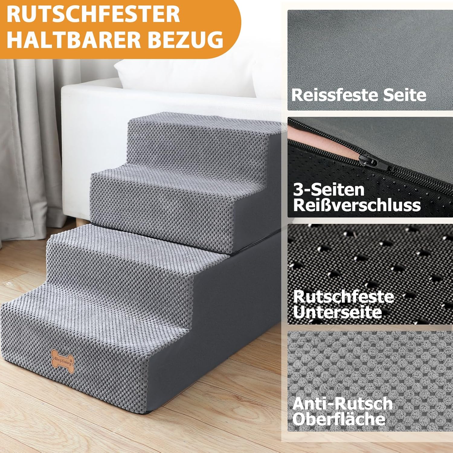 • НЕРЪЗГАЩИ СЕ И МИЕЩИ СЕ СТЪПАЛА ЗА КУЧЕТА: Повърхността на стълбите за кучета е от оребрена кордова материя, която е неплъзгаща се, има по-добро сцепление и е по-добра за захващане от лапите на вашето куче. Неплъзгащите се частици по дъното държат всички стълби за кучета стабилни на място, когато кучето ви се катери. Освен това, покритието на стълбите за кучета е снабдено с ципове, което улеснява поставянето и свалянето им за почистване.