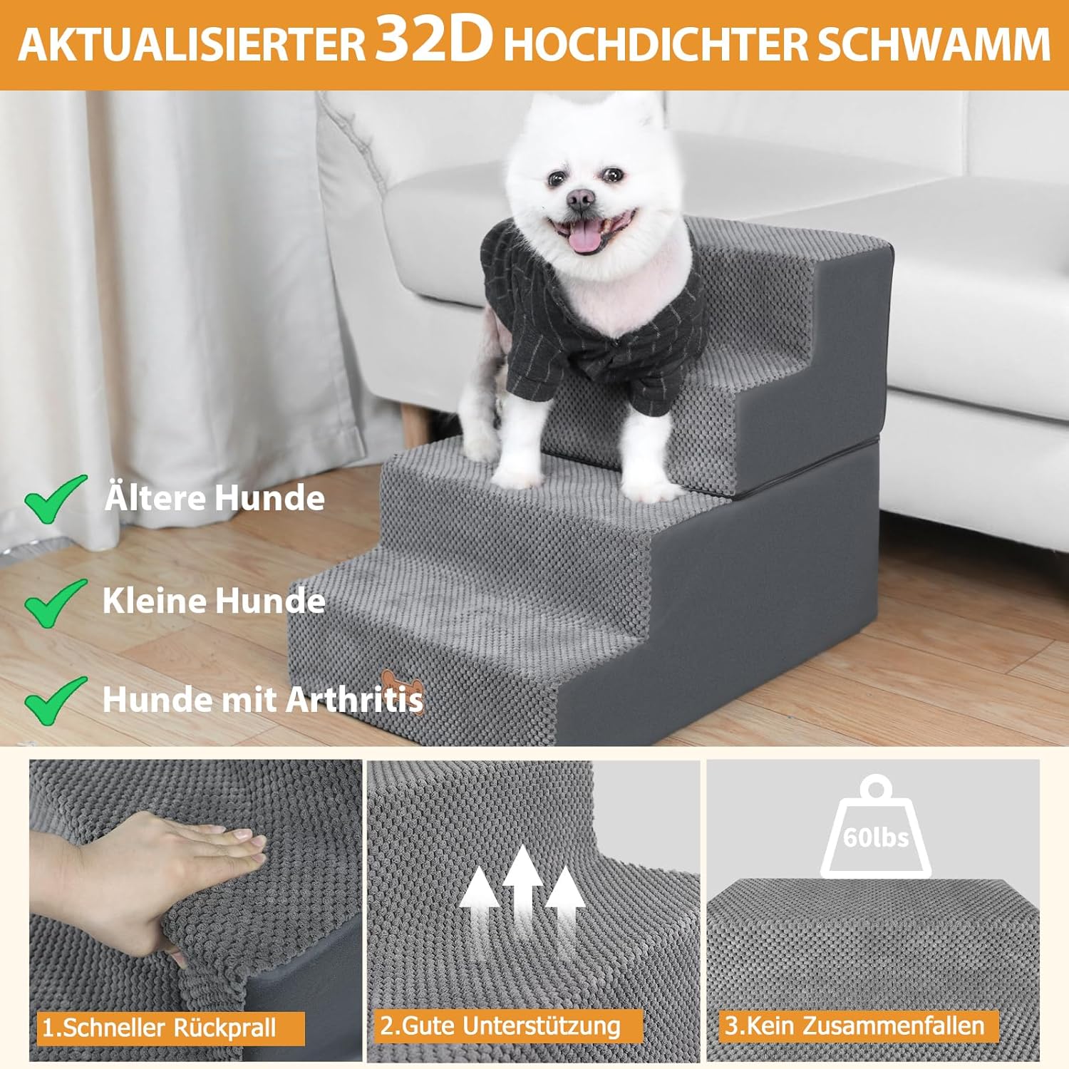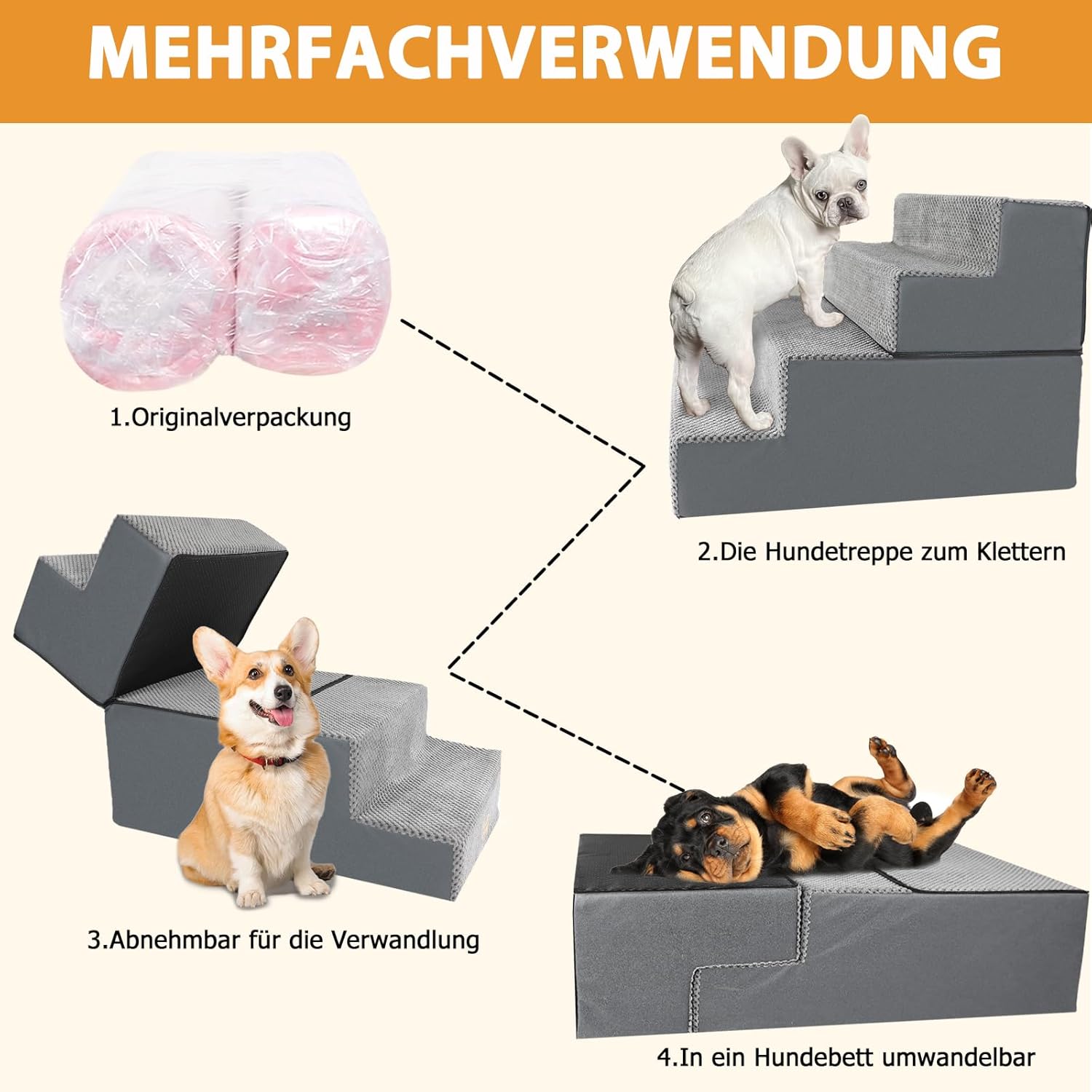 • ОПАКОВКА И ОБСЛУЖВАНЕ Нашите стълби за кучета за малки кучета са вакуумно опаковани. След разопаковане, моля, оставете гъбата за около 24 часа, докато се разгъне напълно. Тези практични и лесни за поддръжка стълби за кучета са идеалният подарък за вашия домашен любимец. Ако имате някакви въпроси относно нашите стълби за кучета, не се колебайте да се свържете с нас и ние ще ви предложим задоволително решение в рамките на 24 часа.