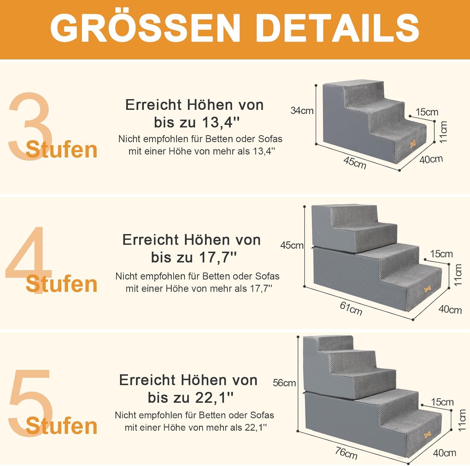 • 3-степенни стълби за кучета: Нашите стълби за кучета са подходящи предимно за кученца, малки кучета, кучета с артрит, по-възрастни кучета и котки и др., които имат затруднения с катеренето. Стълбите за кучета са с размери 45 (Д) x 40 (Ш) x 34 (В) см и са подходящи за повечето легла и дивани. Моля, измерете височината, на която кучето ви трябва да се качи, преди да закупите. Нашите стълби за кучета са много леки и можете лесно да ги местите навсякъде в стаята, когато е необходимо.