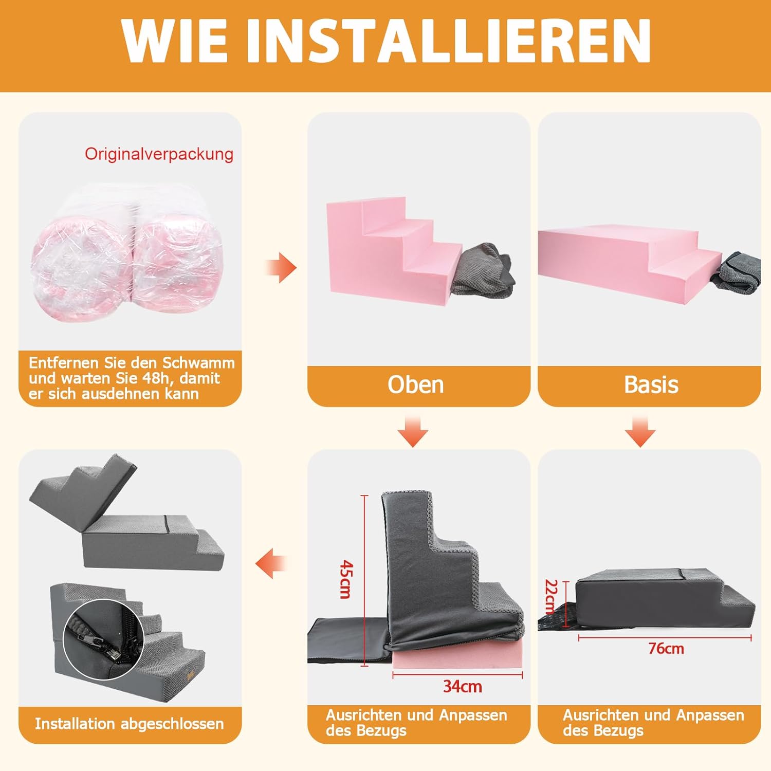 • ОПАКОВКА И ОБСЛУЖВАНЕ Нашите стълби за кучета за малки кучета са вакуумно опаковани. След разопаковане, моля, оставете гъбата за около 24 часа, докато се разгъне напълно. Тези практични и лесни за поддръжка стълби за кучета са идеалният подарък за вашия домашен любимец. Ако имате някакви въпроси относно нашите стълби за кучета, не се колебайте да се свържете с нас и ние ще ви предложим задоволително решение в рамките на 24 часа.