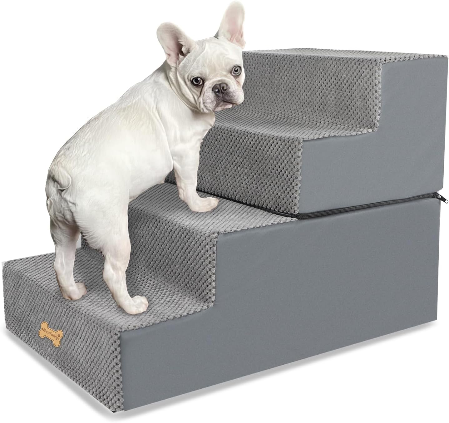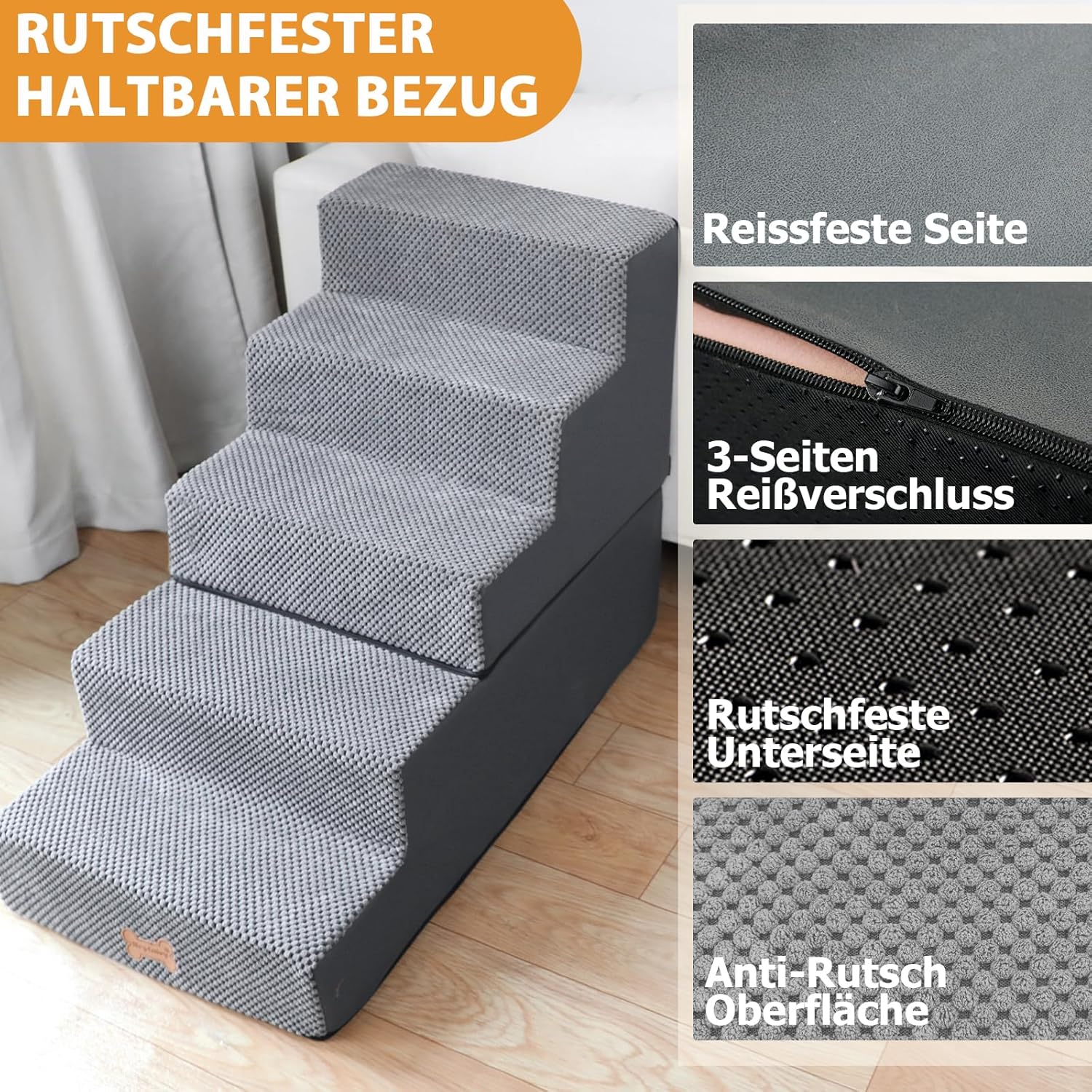 • НЕРЪЗГАЩИ СЕ И МИЕЩИ СЕ СТЪПАЛА ЗА КУЧЕТА: Повърхността на стълбите за кучета е от оребрена кордова материя, която е неплъзгаща се, има по-добро сцепление и е по-добра за захващане от лапите на вашето куче. Неплъзгащите се частици по дъното държат всички стълби за кучета стабилни на място, когато кучето ви се катери. Освен това, покритието на стълбите за кучета е снабдено с ципове, което улеснява поставянето и свалянето им за почистване.
