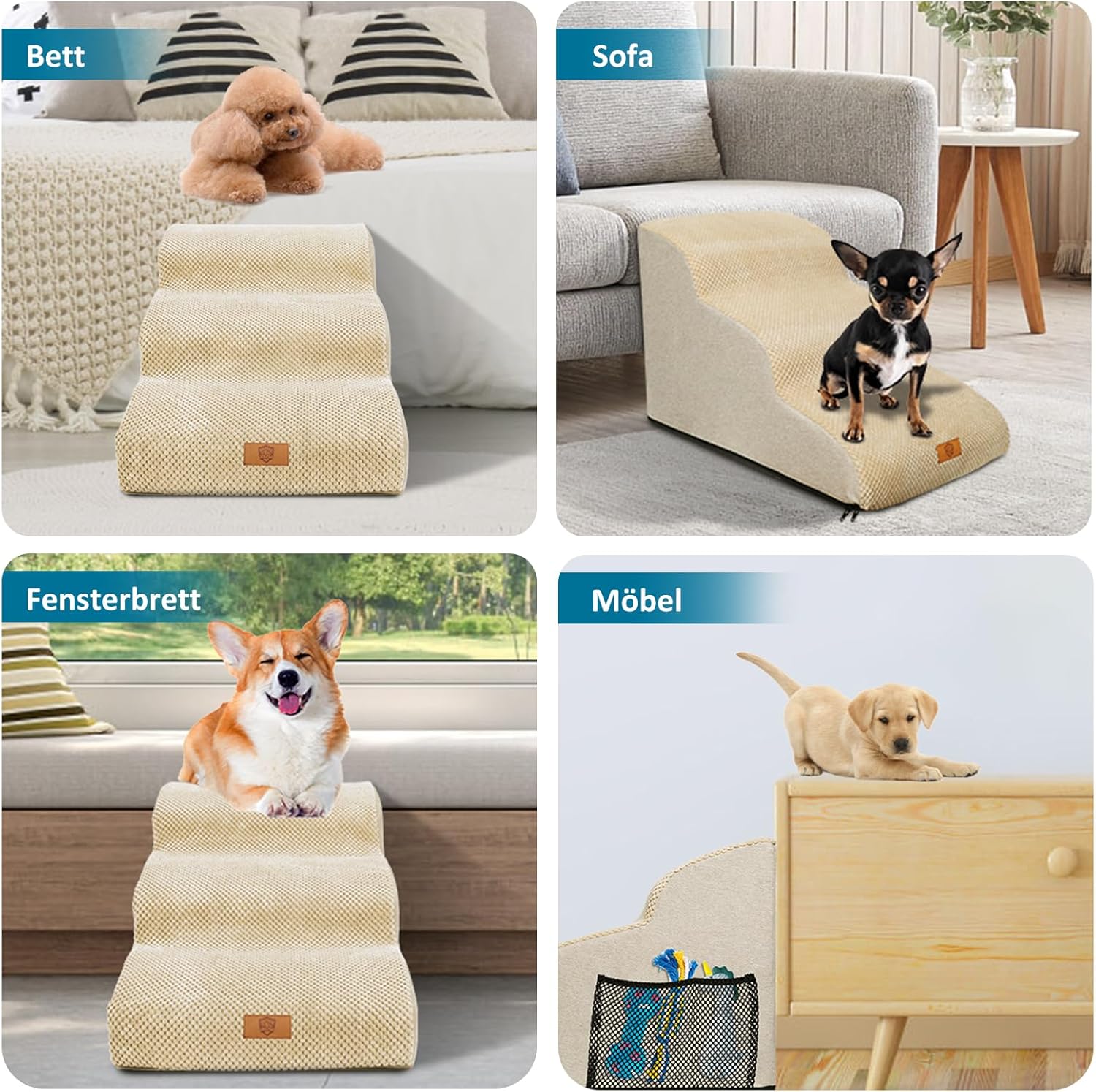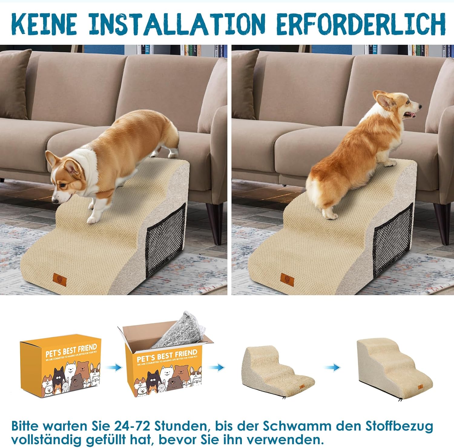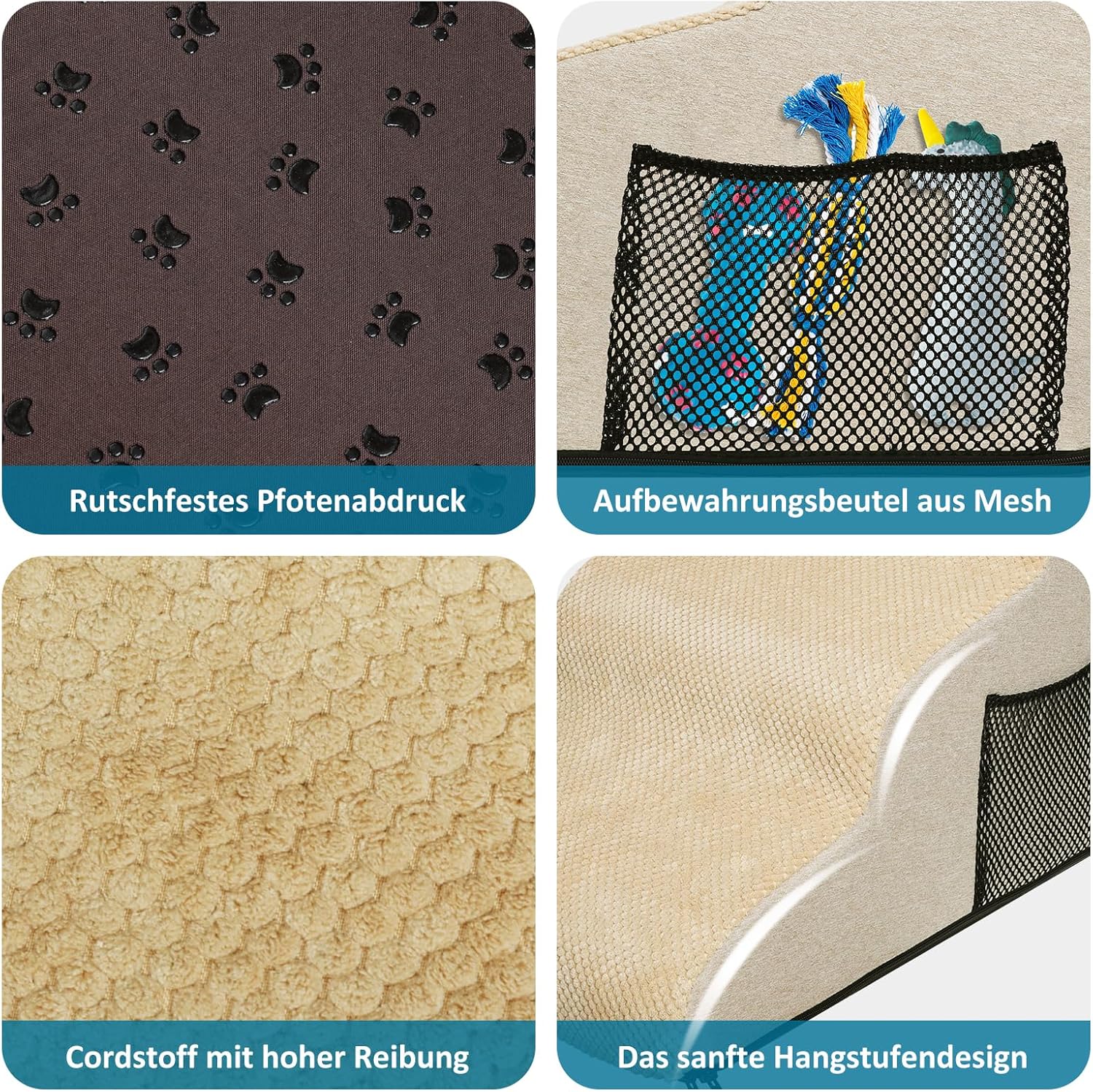• 4-в-1 стълби за кучета с място за съхранение: Многофункционалните стълби за кучета съчетават катерене, почивка, игра и съхранение в едно. Можете да съхранявате принадлежности за домашни любимци в кутията за съхранение. Стълбите за домашни любимци имат 3 стъпала с различна височина. Те могат да се комбинират по желание или да се използват самостоятелно. Горното стъпало е повтарящо се, така че вашето кученце ще може да подремне на него.