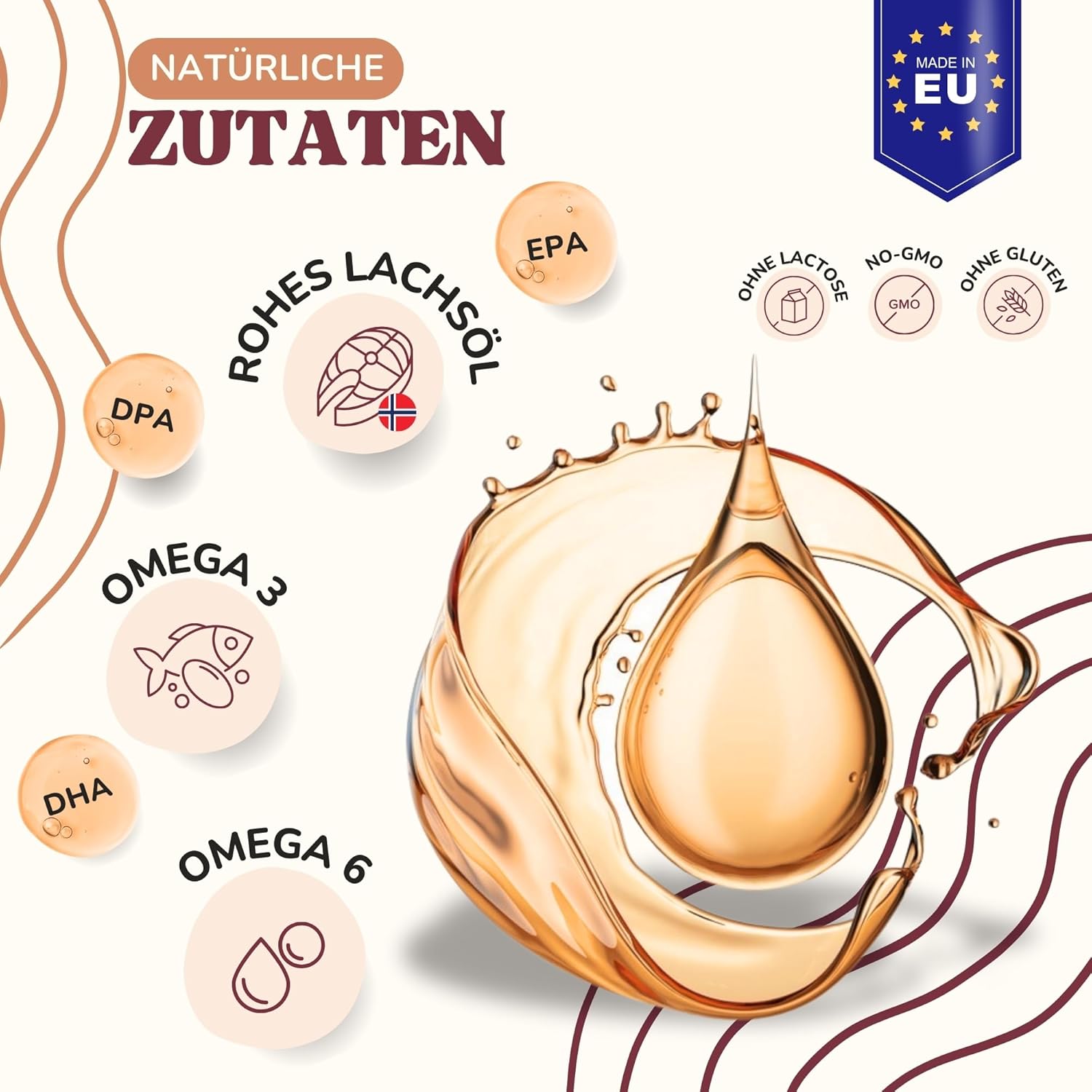 • НАТУРАЛНО И ОБОГАТЕНОНашето масло от сьомга за кучета е направено от чисто натурални съставки, които осигуряват оптимално и здравословно хранене за вашето куче. Обогатено с есенциални мастни киселини Омега 3 и Омега 6, EPA и DHA, и без токсини, изкуствени добавки или консерванти. Идеално за цялостното благополучие на вашето куче.