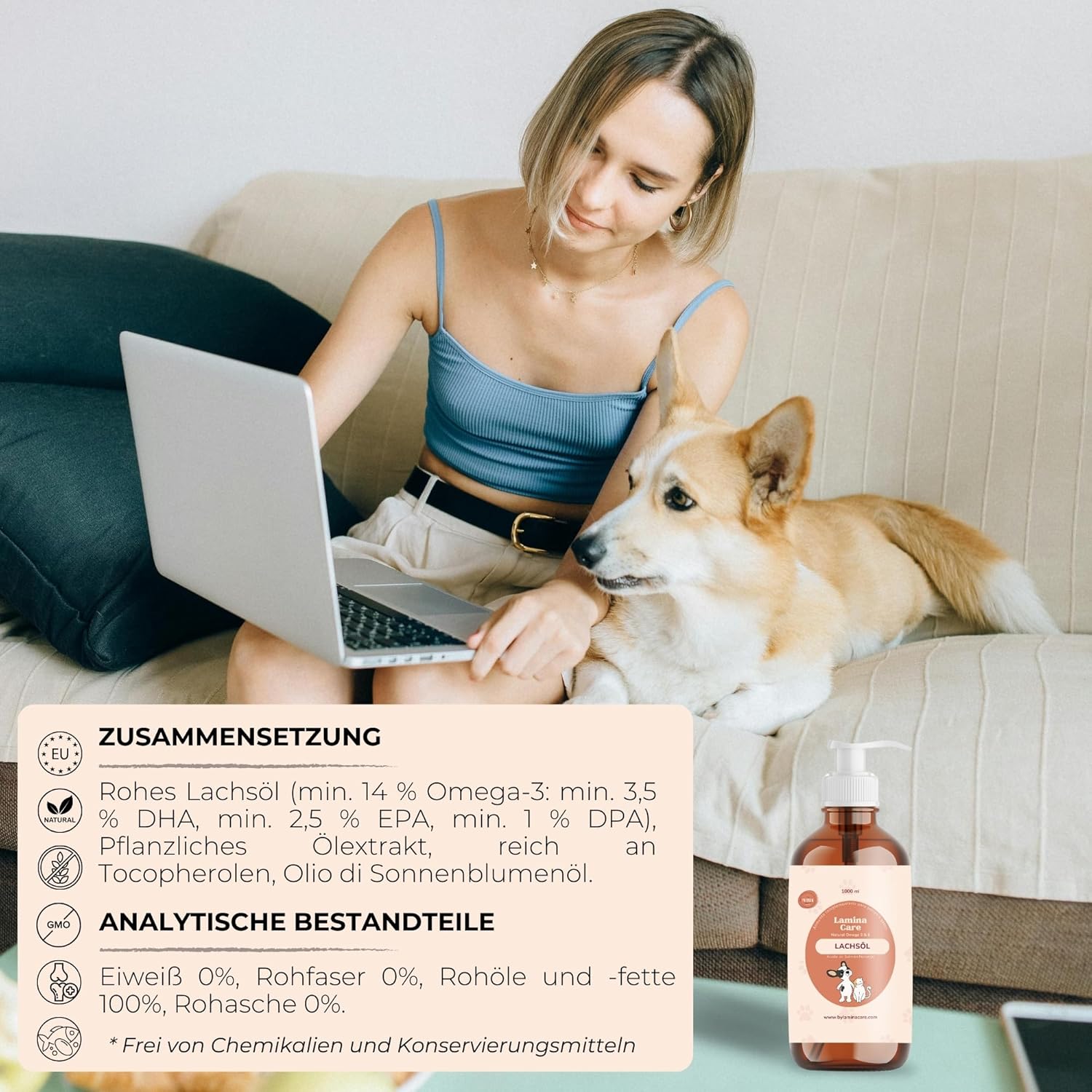 • LAMINA CARE СЕ ГРИЖИ ЗА ВАШИТЕ ДОМАШНИ ЛЮБИМЦИ Любовта ни към животните се отразява в разработването на висококачествени натурални продукти. С всяка хранителна добавка за кучета, ние потвърждаваме ангажимента си да се отнасяме към вашия домашен любимец като към член на семейството. Всички наши продукти за грижа за котки и кучета са произведени в Европа: 9 от 10 препоръчват нашето рибено масло за котки и кучета!