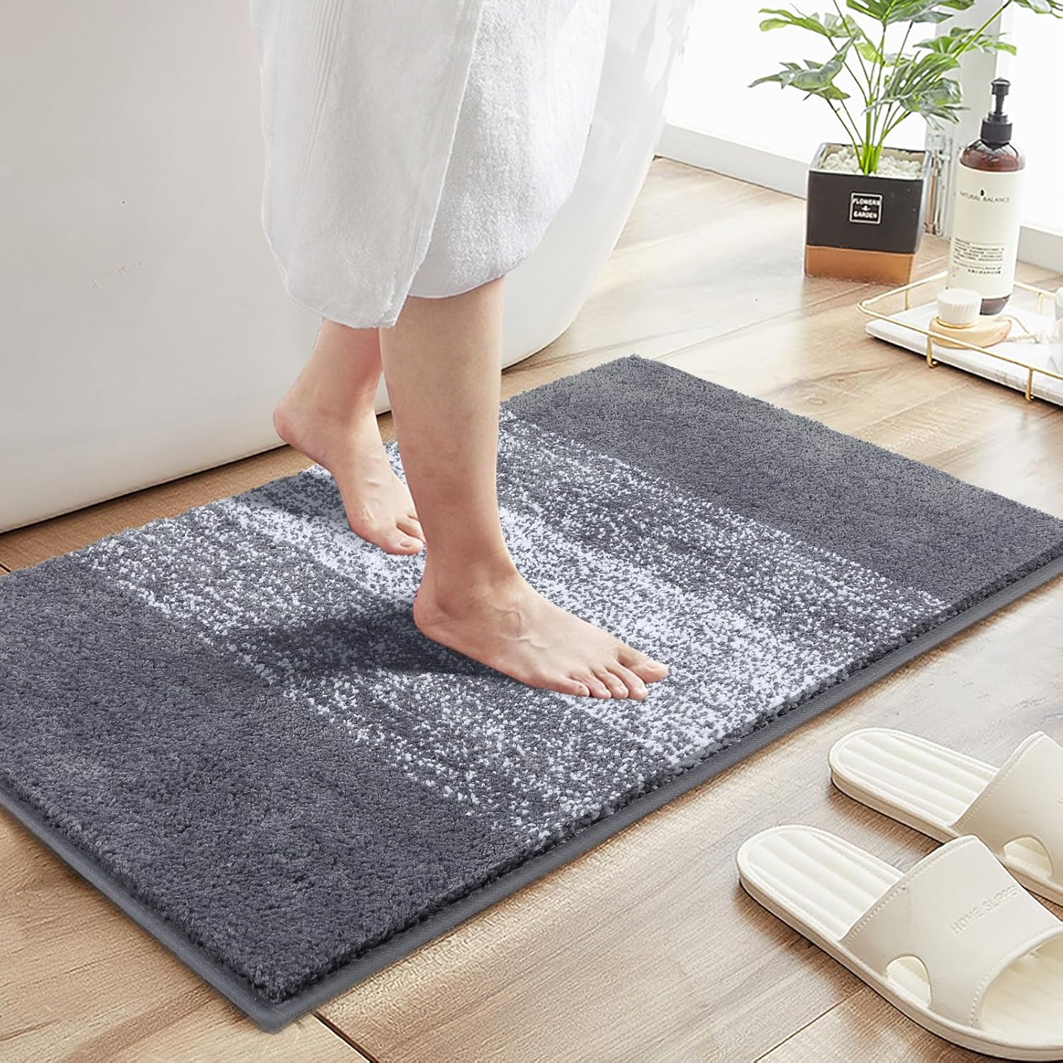 • Голям капацитет за абсорбиране на вода: рошавата микрофибърна постелката за баня е по-абсорбираща от памучните килими за баня. Високият 15 мм косъм предпазва пода от капене на вода, докато излизате от ваната, душа или спа центъра, или се приготвяте до мивката. Влагата се задържа в дълбокия косъм на постелката за баня, поддържайки пода на банята чист и сух.