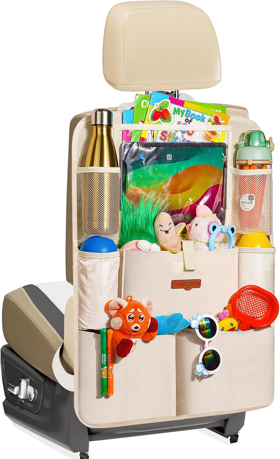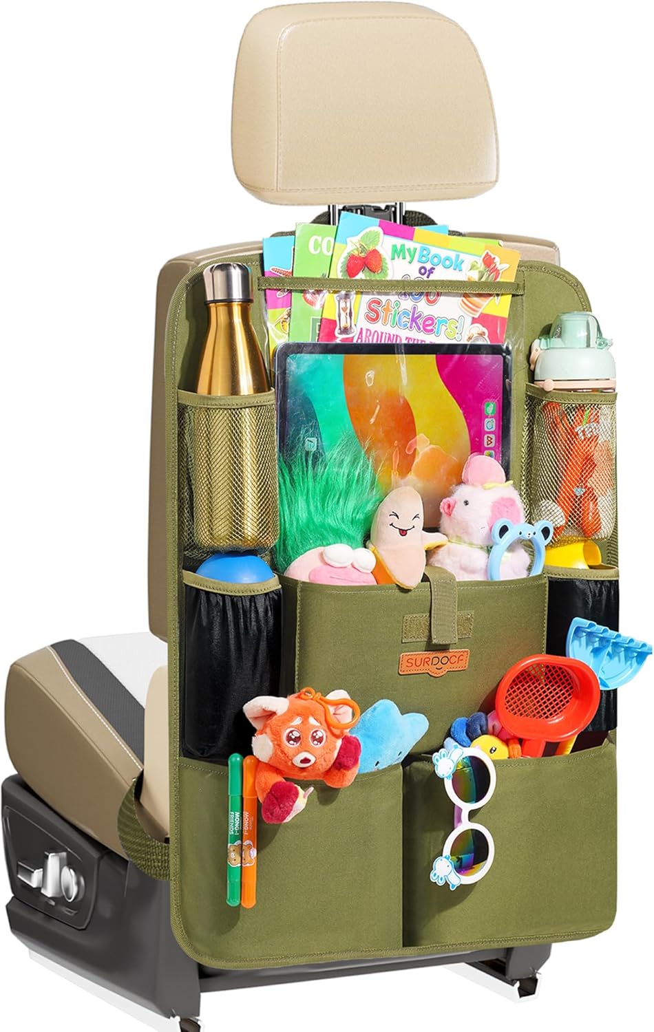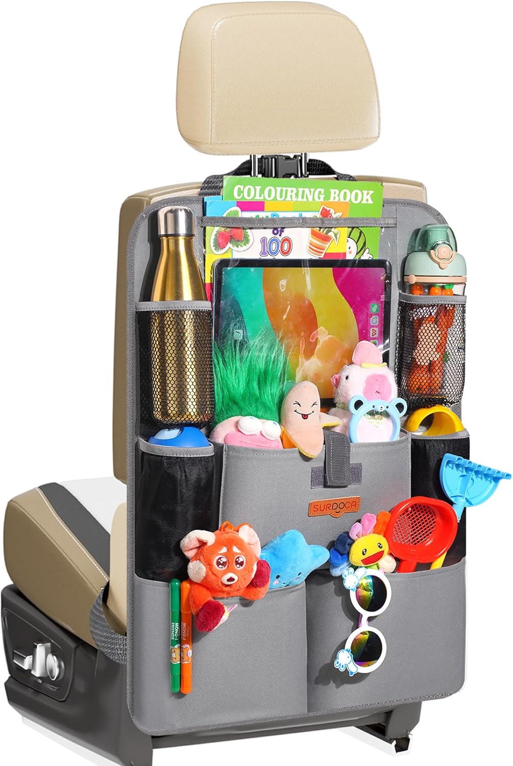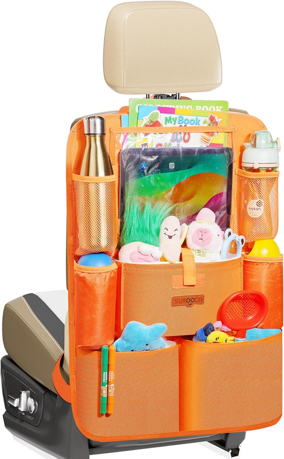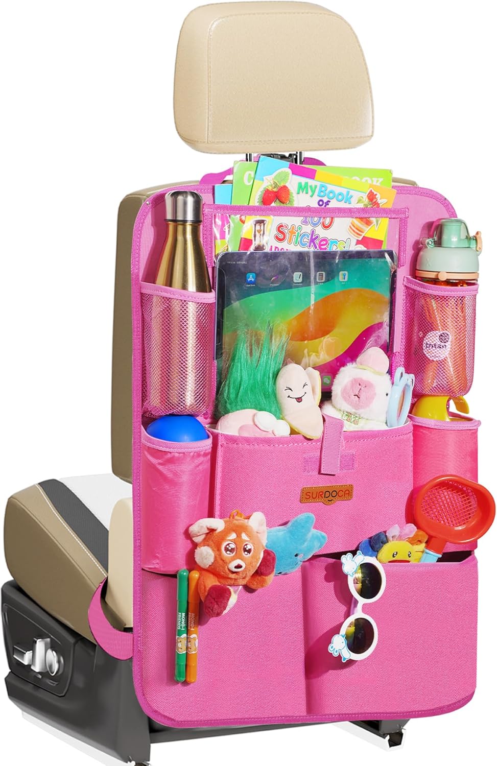 • Лесен монтаж: Органайзерът за задна седалка на детската кола SURDOCA има регулируеми презрамки, които могат да се прикрепят към 99% от автомобилните седалки, което го прави лесен за монтаж и съвместим с повечето модели автомобили. Моля, имайте предвид обаче, че може да не е подходящ за определени спортни седалки.