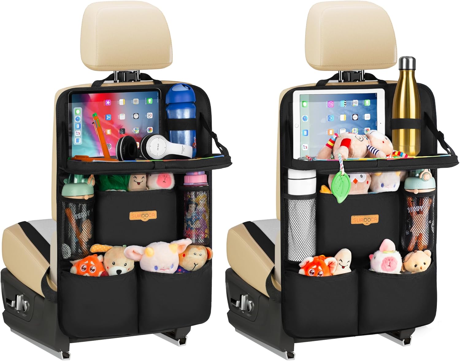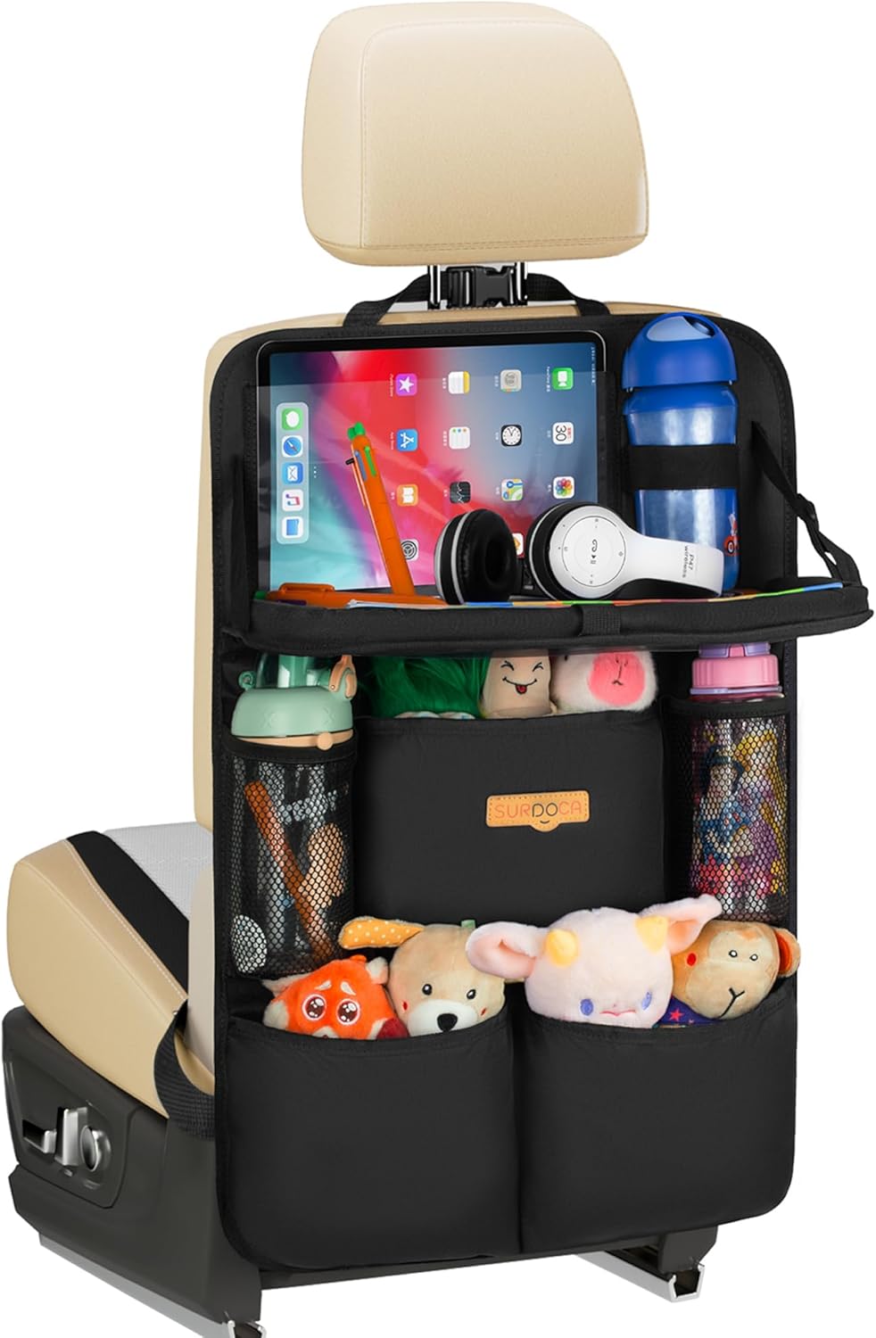 SURDOCA Органайзер за автомобилна седалка със сгъваема маса, 7 джоба, джоб за таблет, висящ органайзер за задна седалка за деца и пътуване, универсален за повечето автомобили