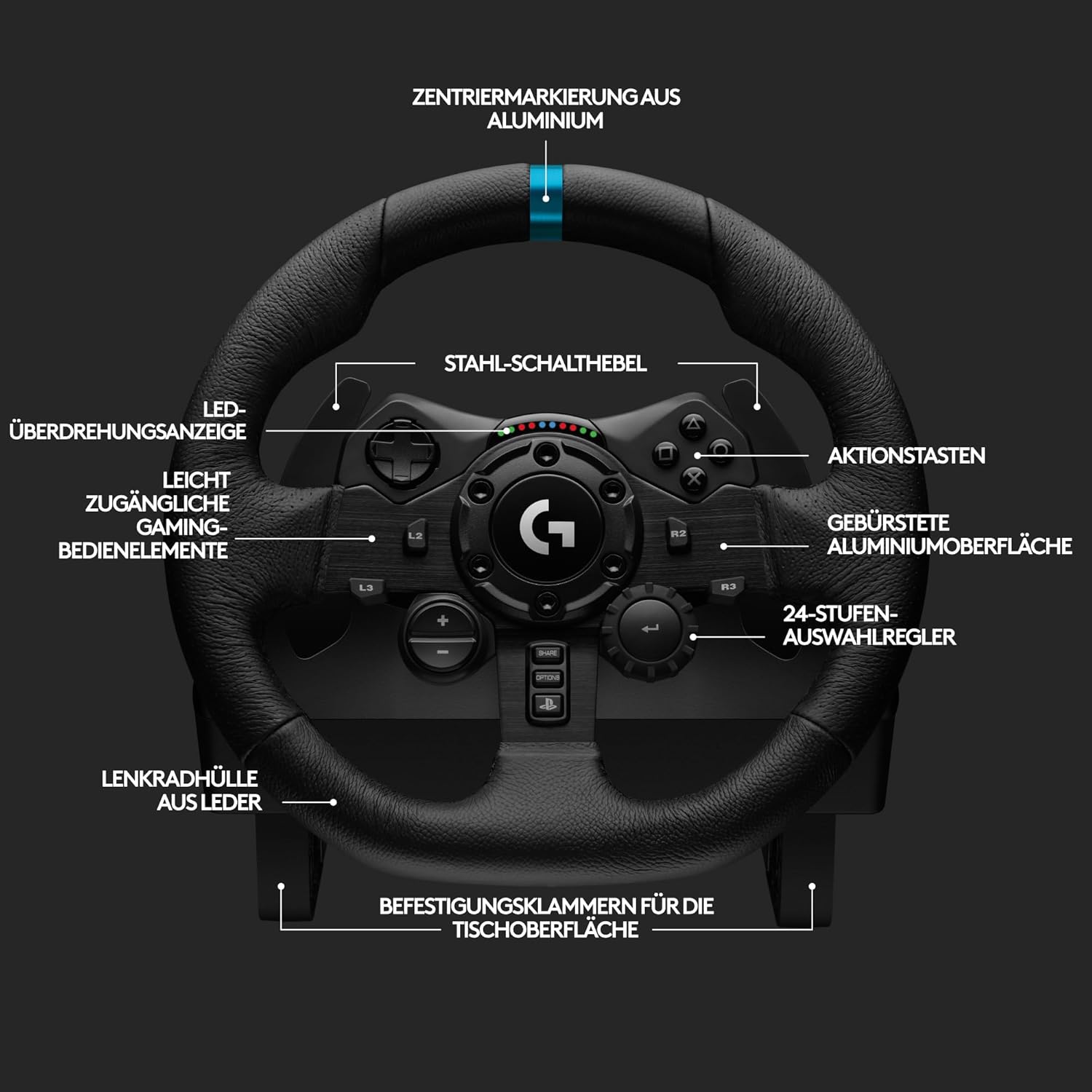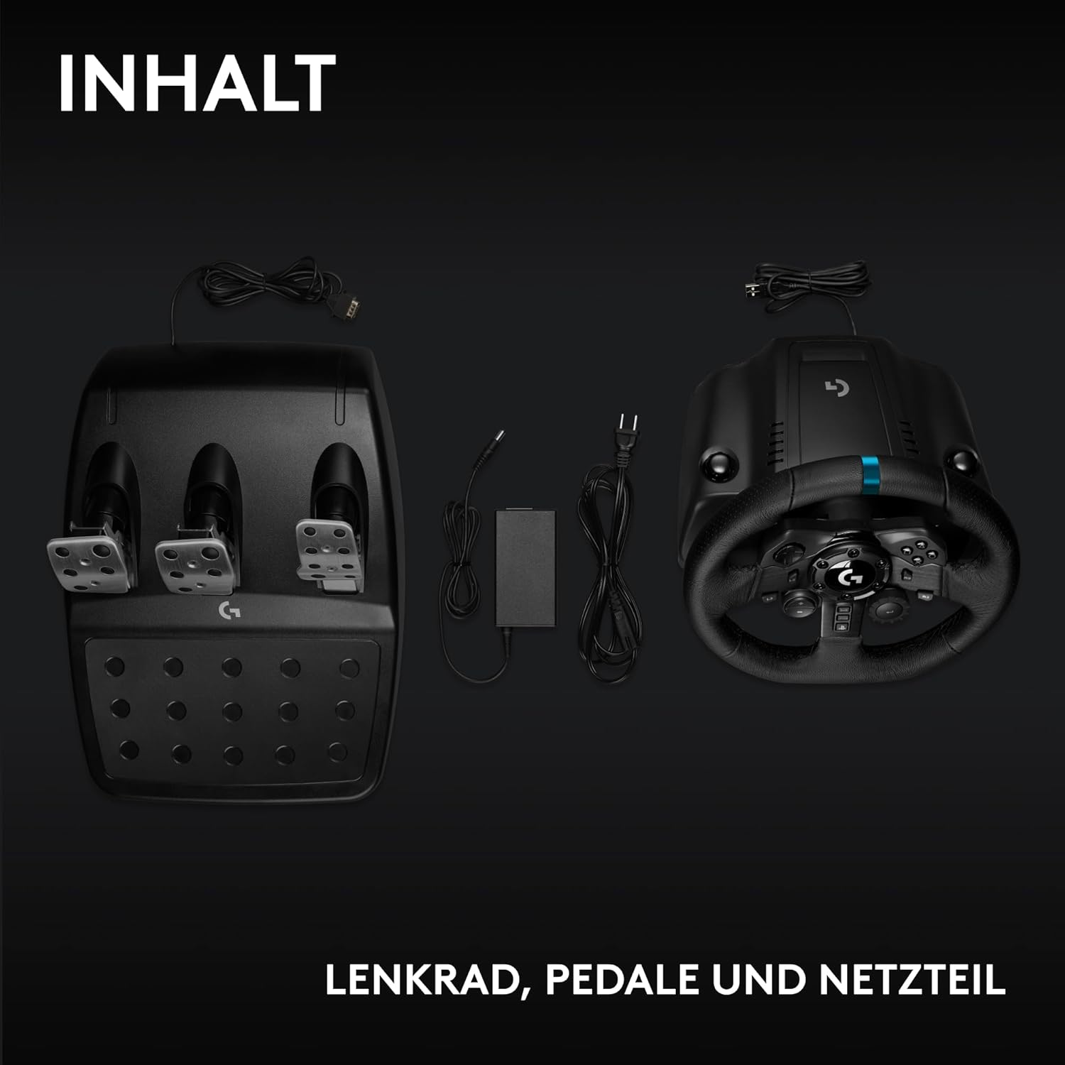 Състезателен волан Logitech G923 Gaming TRUE FORCE с педали, обратна връзка до 1000 Hz, бърза реакция на педалите, система с двоен съединител, кожен волан, за PS5, PS4 и PC - черен