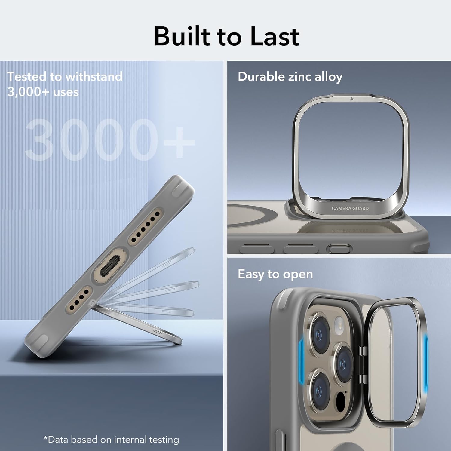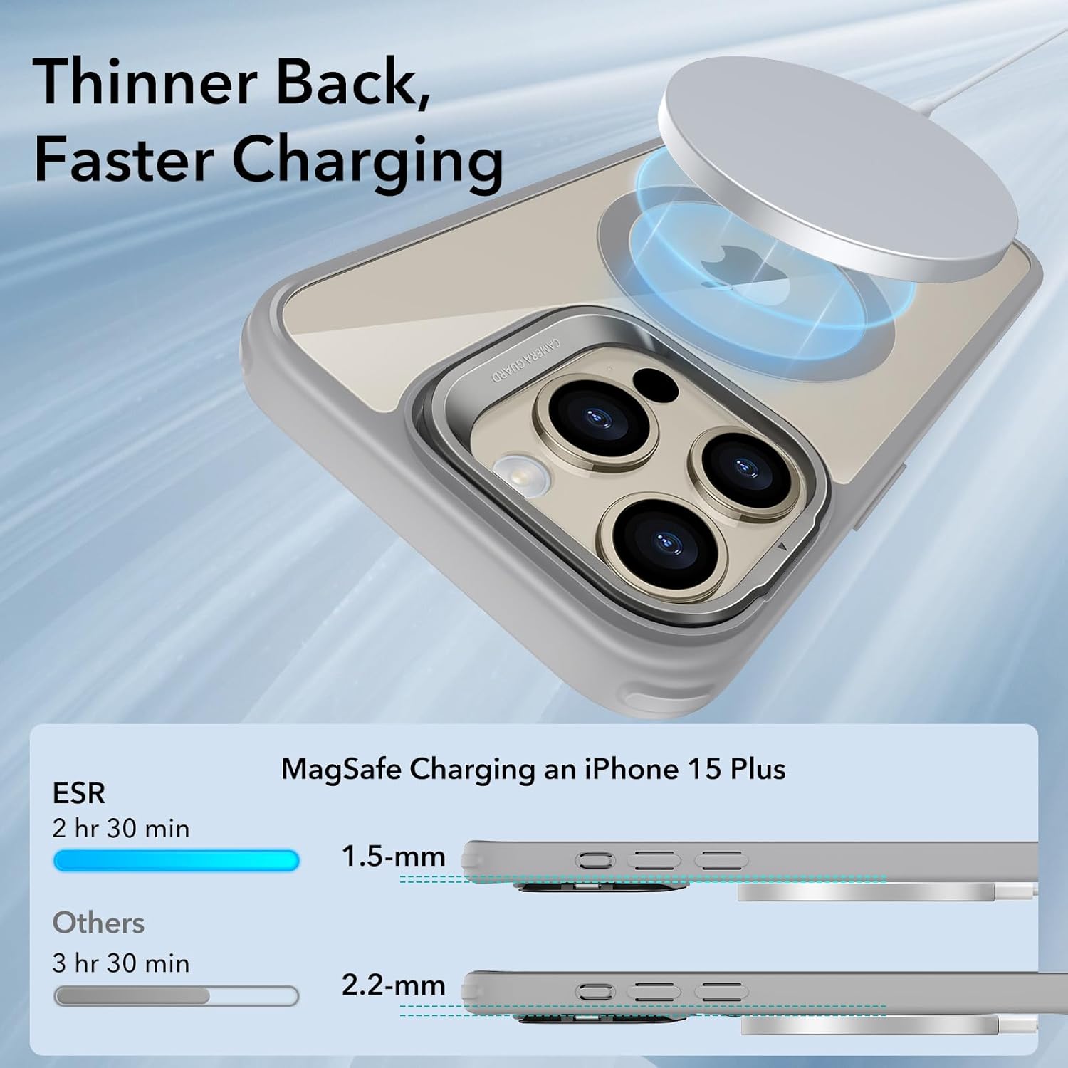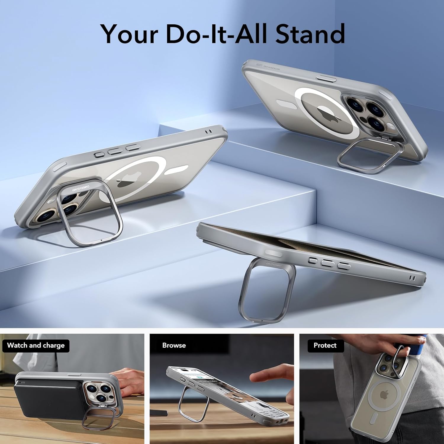 Съвместим с ESR MagSafe за iPhone 15 Pro Max, сертифициран калъф за мобилен телефон с военна защита, калъф за iPhone 15 Pro Max, вградена скрита стойка, защитен калъф за гръб, устойчив на надраскване, прозрачно сив