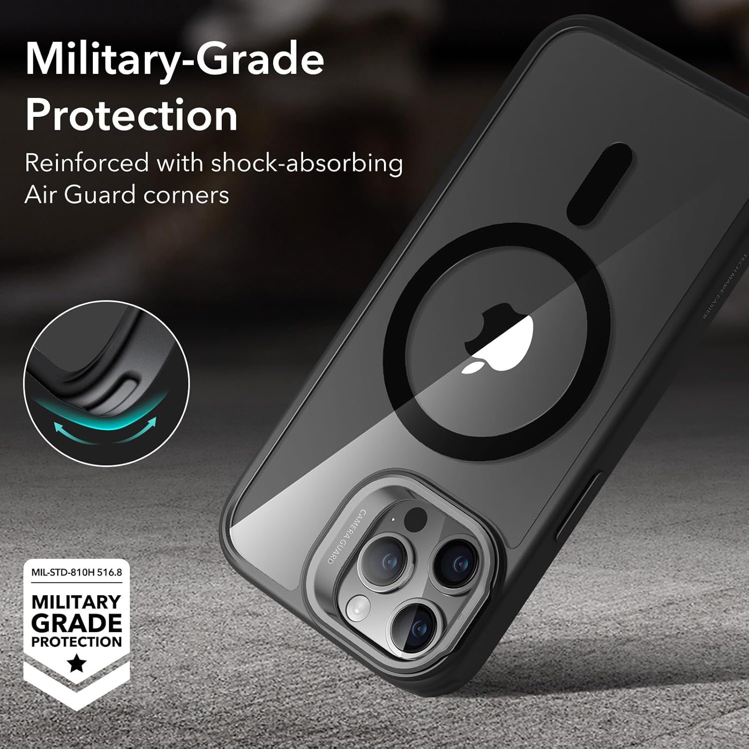 Съвместим с ESR MagSafe за iPhone 15 Pro Max, сертифициран военен защитен калъф за мобилен телефон, калъф за iPhone 15 Pro Max, вградена скрита стойка, защитен калъф за гръб, устойчив на надраскване, прозрачен черен цвят