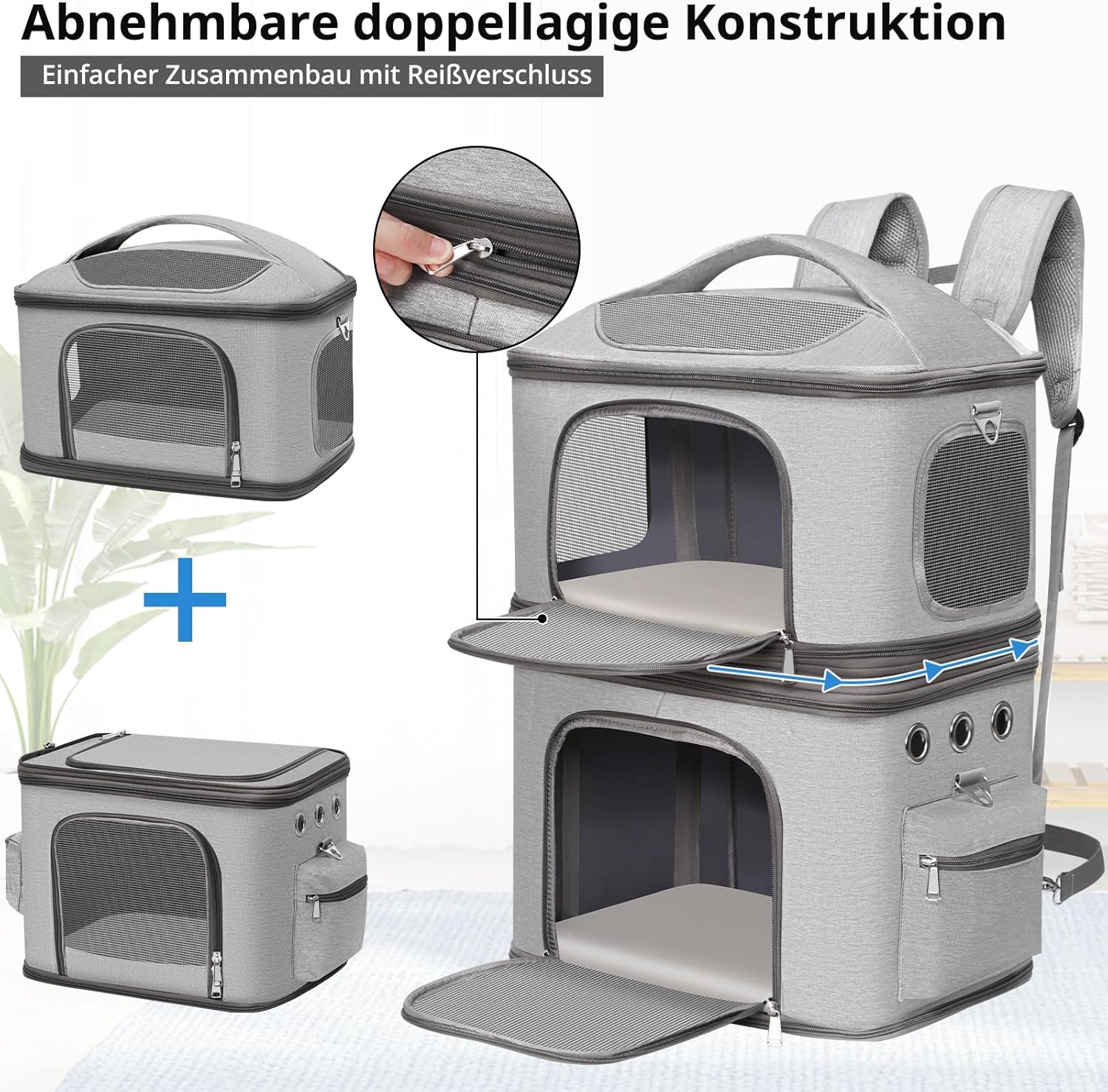 • Подвижен дизайн с две отделения: с иновативния двуслоен дизайн можете удобно да транспортирате два домашни любимца едновременно! Само с отваряне на централната връзка можете лесно да разделите раницата на два отделни джоба за домашни любимци, които са идеални за различни нужди при пътуване - идеални за няколко домашни любимци или за индивидуална употреба. Тази многофункционална раница е вашият идеален спътник за всяко пътуване.
