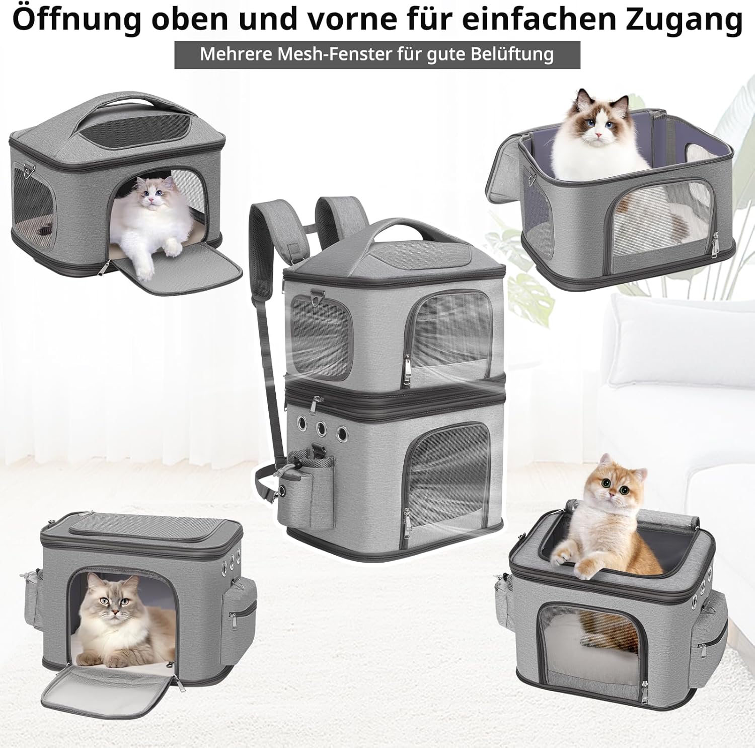 Сваляща се раница за котки за 2 котки до 12 кг, Сгъваема кутия за транспортиране на котки, Голяма раница за 2 котки, Идеална за пътуване, туризъм, къмпинг, Сива