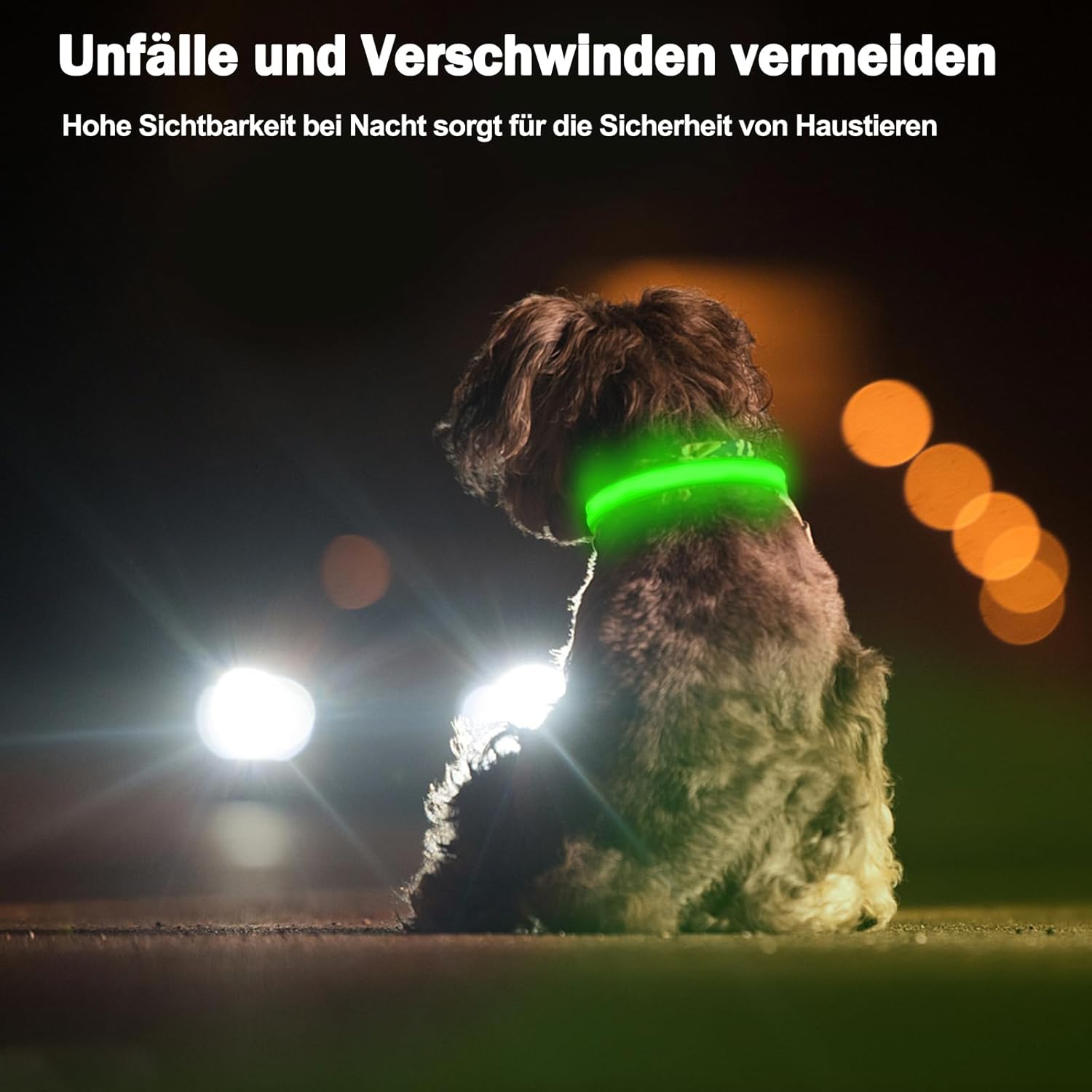 • Светлинен нашийник с висока видимост за кучета: нашите светлинни нашийници за кучета са оборудвани с по-ярък и привличащ вниманието светещ пръстен, така че можете веднага да видите точната позиция на вашия четириног приятел във всеки храст и трева. Специално за „тъмния сезон“, светлинният нашийник гарантира, че вие, минувачите, велосипедистите и автомобилистите можете да видите кучето си от голямо разстояние и по този начин да избегнете инциденти и изчезвания.