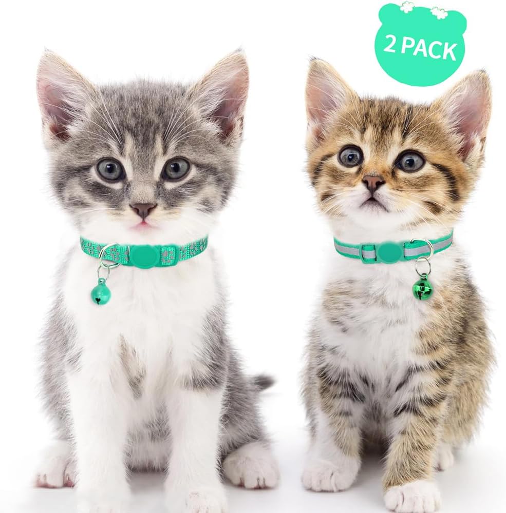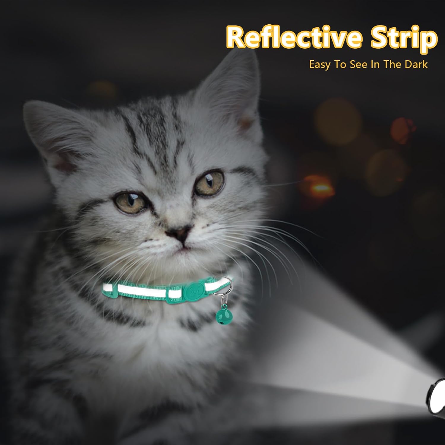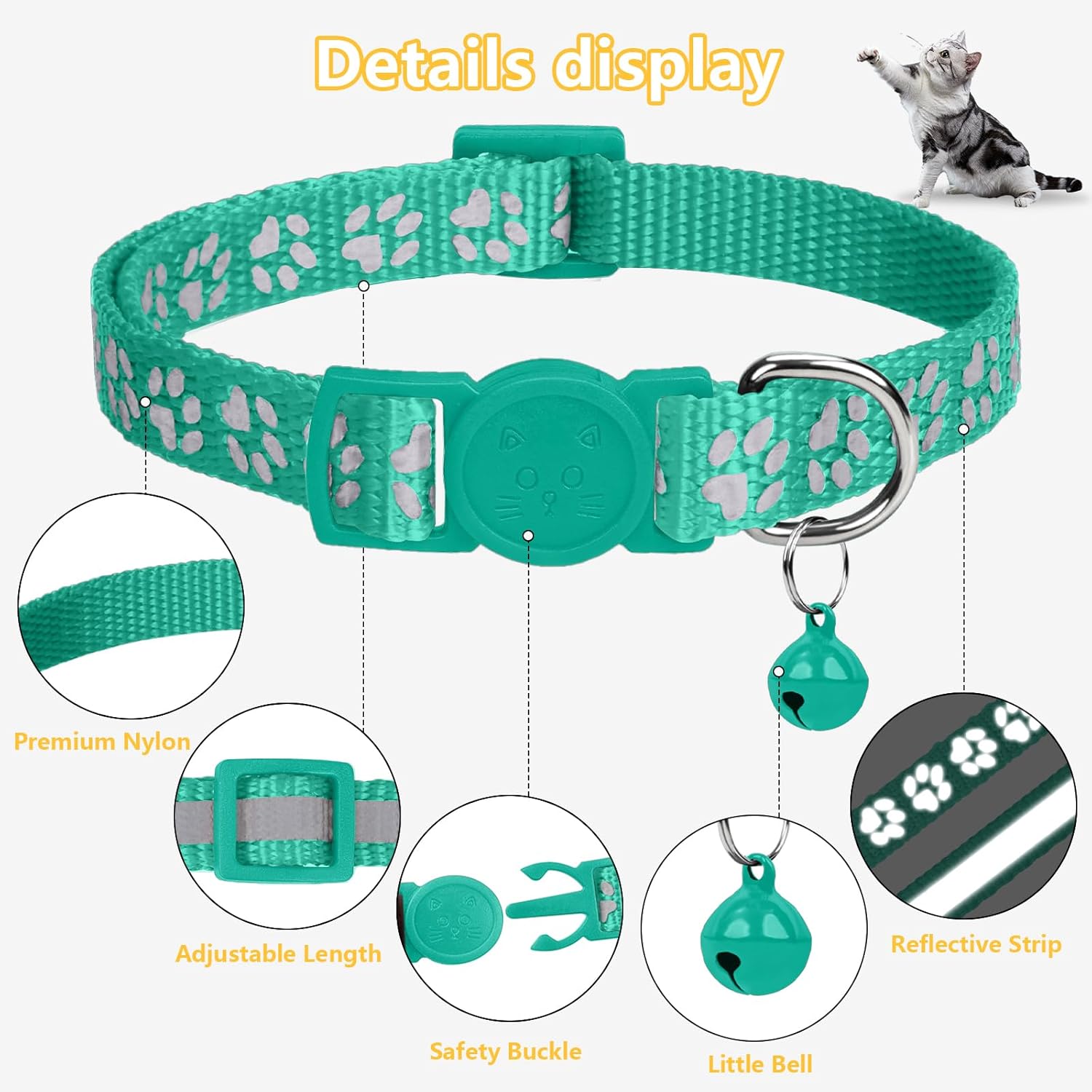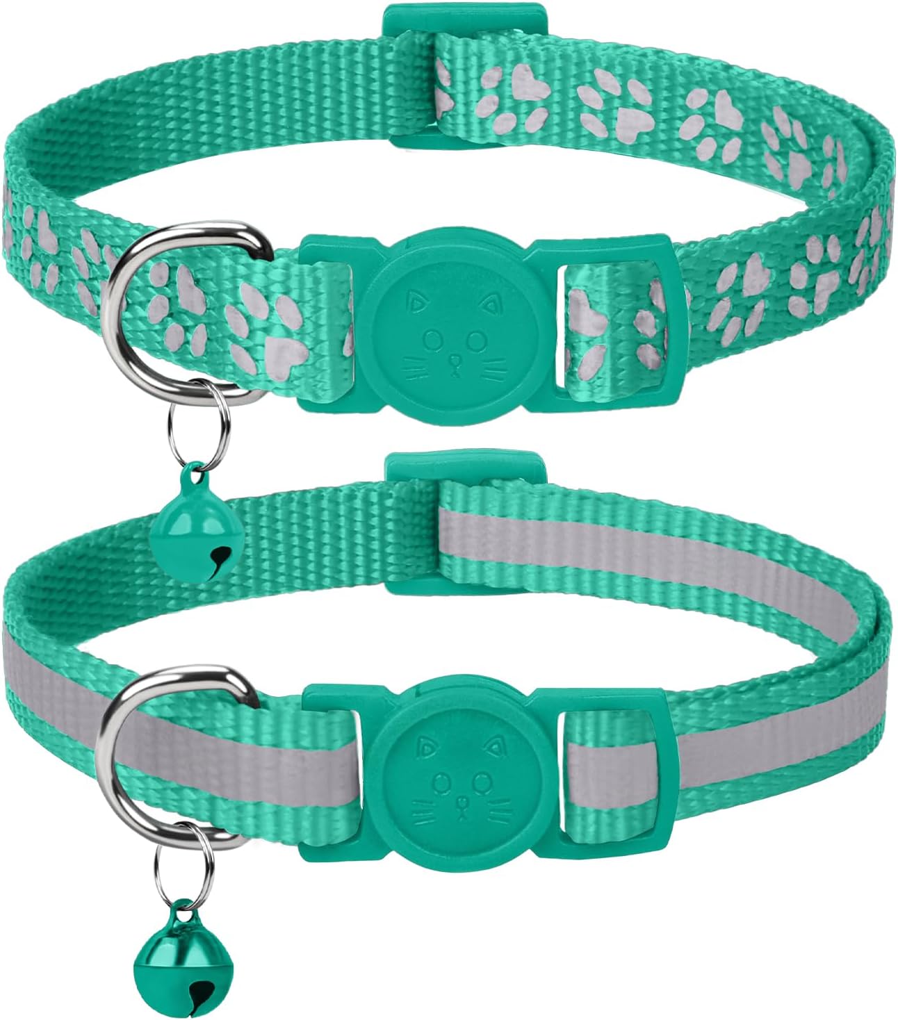 Светлоотразителен нашийник Taglory за котки с предпазна закопчалка и звънец, пакет от 2 регулируеми нашийника за котки и котенца 15-20 см, тюркоазен