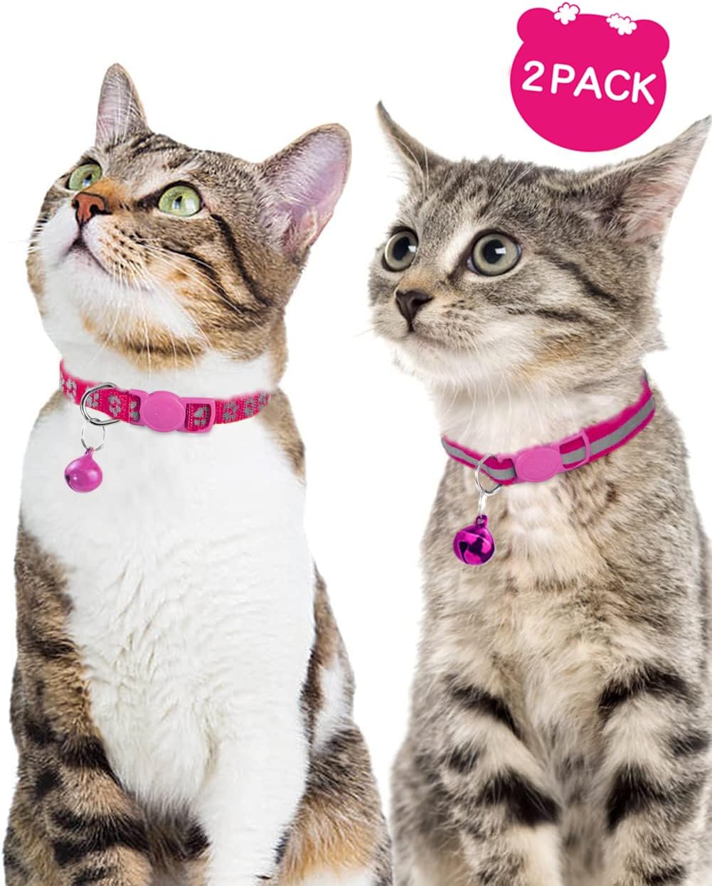 Светлоотразителен нашийник за котка Taglory с предпазна закопчалка и звънец, пакет от 2, регулируем нашийник, 19-32 см, ярко розов