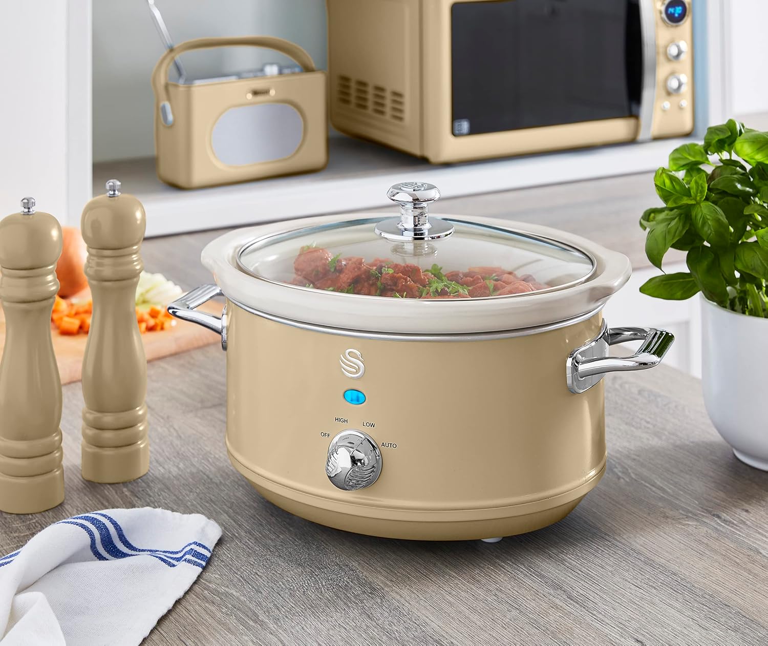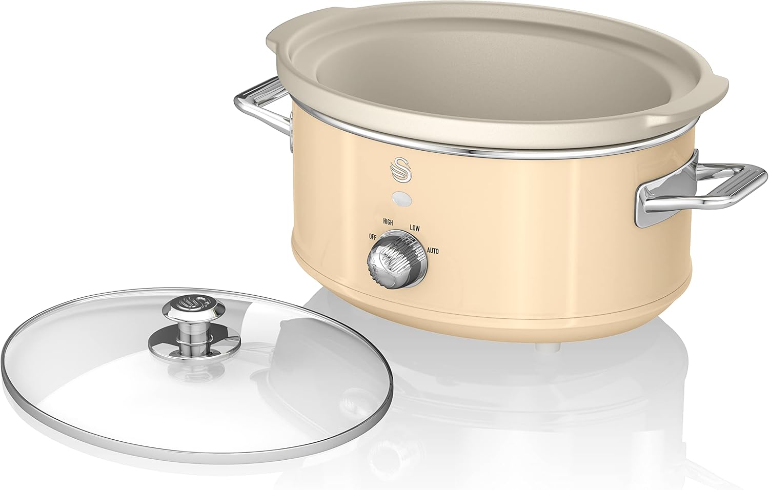 Swan Retro SF17021CNEU Бавна готварска печка 3.5L Сваляем съд за готвене, Керамичен незалепващ съд без PFOA и PTFE, 3 температурни нива, Стъклен капак, Винтидж дизайн, Кремав, 200W
