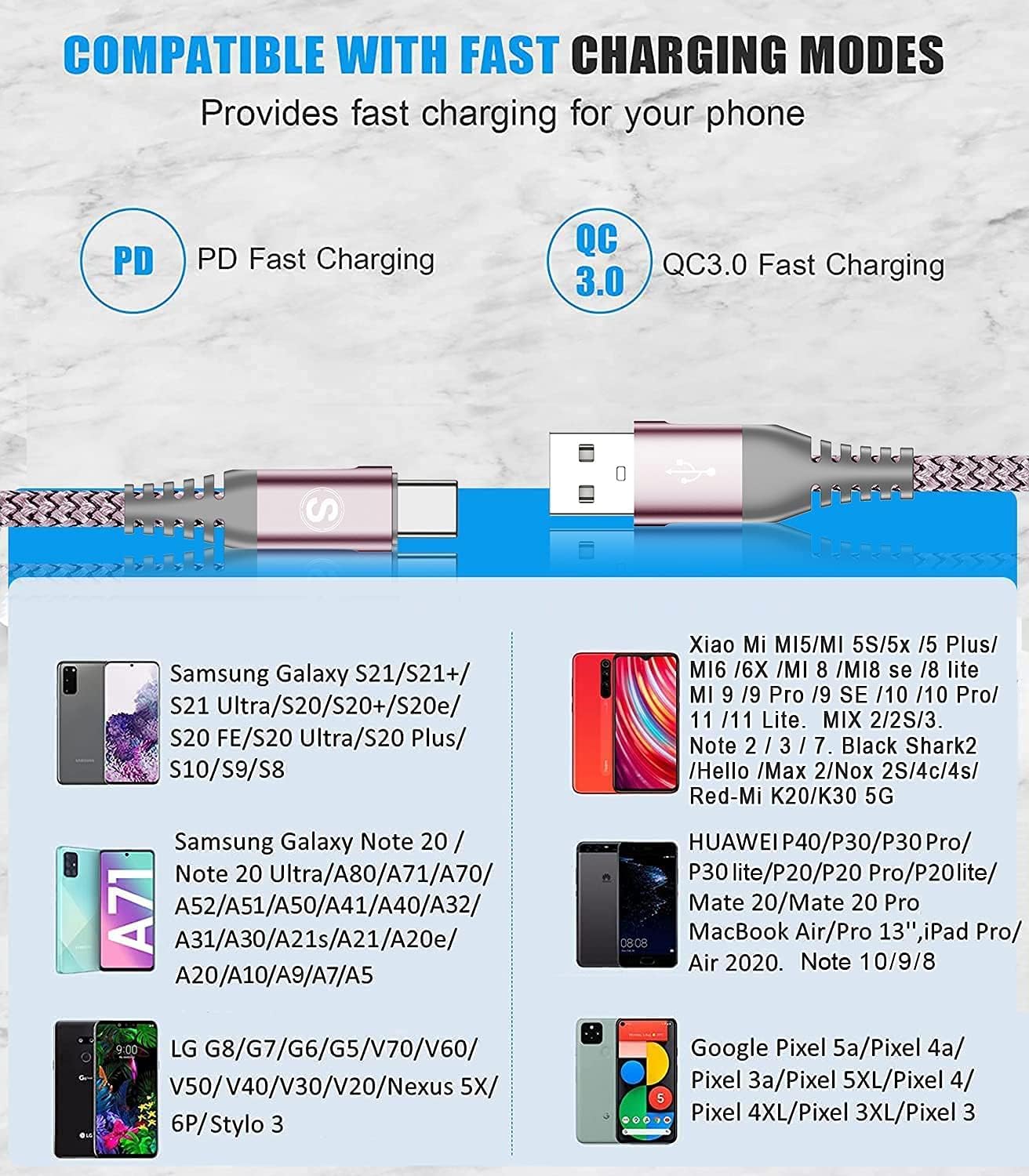 Sweguard USB C кабел [2 бр. 1 м] USB Type-C кабел за зареждане Найлонов Type-C кабел за Samsung Galaxy S10 S9 S8 Plus, Note10, Note9, M31, M30s, M20, A20e, A71, A51, A50, A40, A10e, A7, Mi9, Mi8, Redmi Note 8 Pro, LG G7