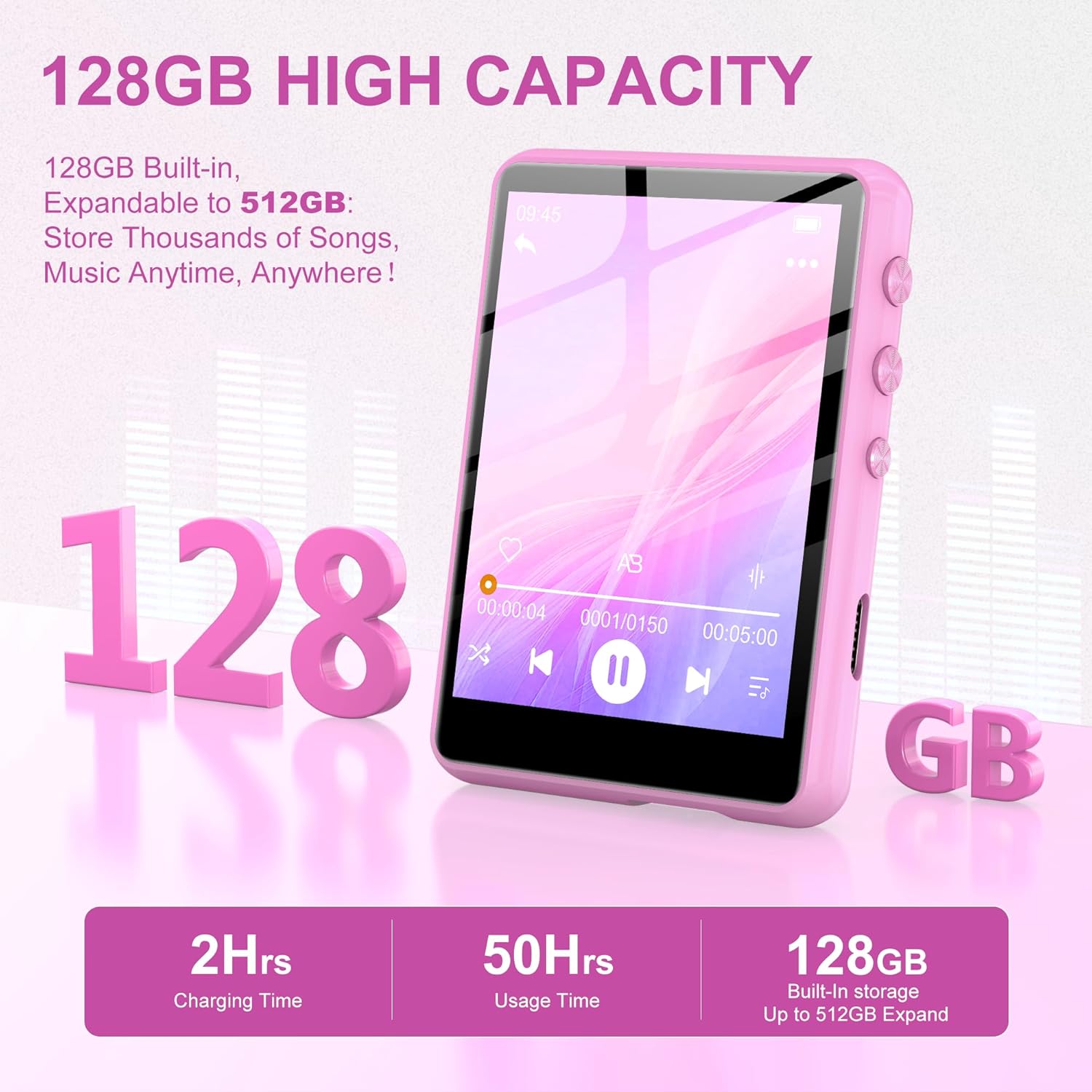 SWOFY 128GB MP3 плейър с Bluetooth 5.3-2.4-инчов сензорен екран, HiFi звук, вграден високоговорител, функция за запис, FM радио, може да се разшири до 512 GB (розов)