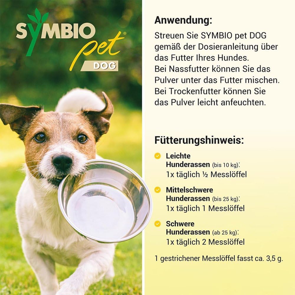 SYMBIO pet DOG sollte mindestens 4 Wochen lang über das Futter verabreicht werden. 1 gestrichener Messlöffel fasst ca. 3,5 g.