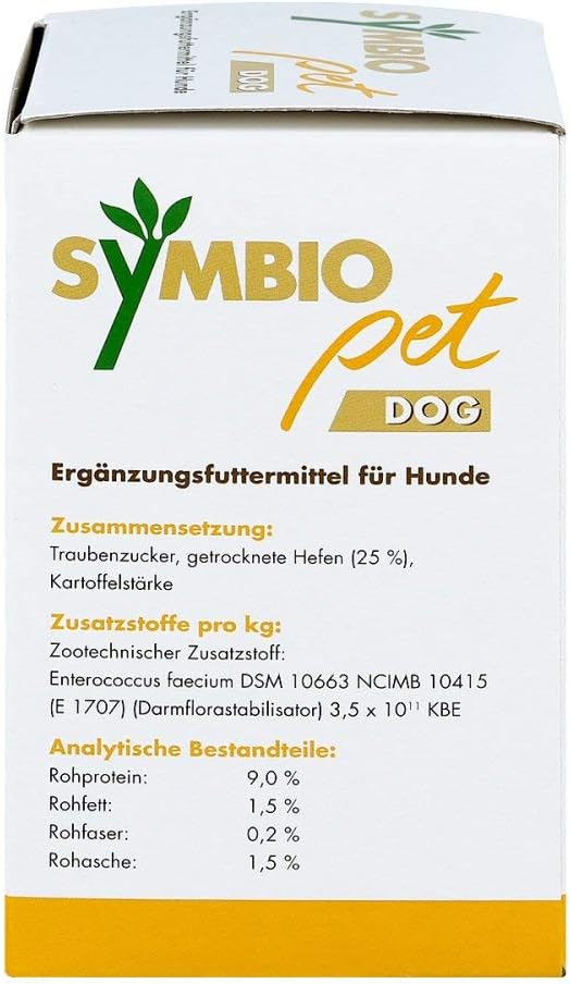 SYMBIO pet DOG съдържа пробиотични бактерии от щама Enterococcus faecium, витаминизирана мая, пребиотично картофено нишесте и декстроза.