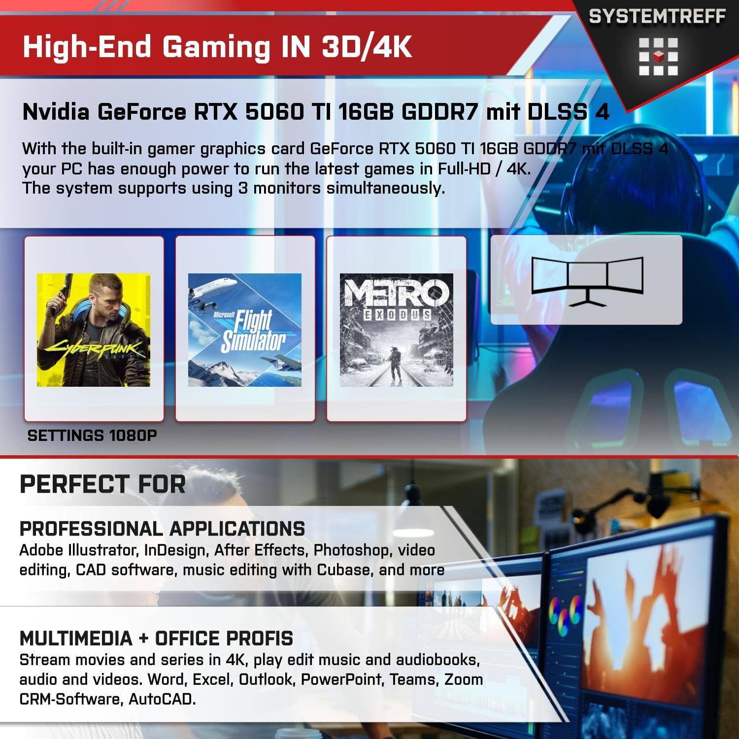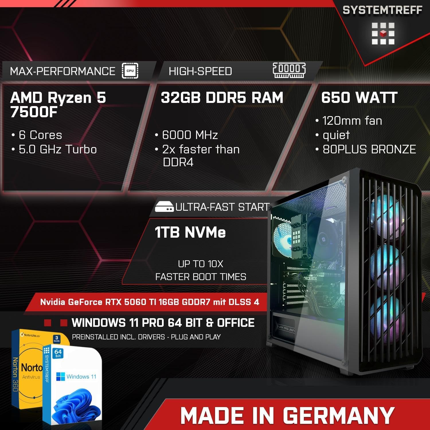 Изображението на кутията е същото - интериорът може да варира. Оборудване: Процесор: AMD Ryzen 5 7500F процесор с 6 ядра и 3.7 GHz (Turbo до 5 GHz) Охладител за процесор: Systemtreff ITS-Raven Дънна платка: Gigabyte A620M H (PCIe 4.0, 1x HDMI, 1x DP, 1x PS/2, 4x USB 2.0 (480 Mbit/s), 2x USB 3.2 Gen1 (5 Gbit/s), LAN, 3x 3.5mm audio) RAM памет: 32GB DDR5-6000 CL30 Flare X5 Графика: Nvidia RTX 5060 Ti 16GB Технология: (4K, GDDR7, 256bit, PCIe 5.0, DX12, DLSS 4) подходящ за: 4K игри, видео редактиране, свързване на до 4 монитора 1. Твърд диск: 1TB NVMe WD SN3000 (5000 MB/s (четене) - 4200 MB/s (запис)) Операционна система: Windows 11 Pro, включително предварително инсталирани драйвери Вирусен скенер: Norton 360 Security с Game Optimizer 1 година защита за 3 устройства. Мрежа: Realtek 1 Gigabit LAN контролер (1000Mbit/s) WLAN: 2 в 1 - Bluetooth/Wlan USB stick) Звук: Realtek 7.1-канален High Definition Audio Кутия: Systemtreff Equinox-Air ST-502 (38cm x 20.5cm x 45cm) закалено стъкло , RGB осветление (управляемо чрез бутон) Захранване: 650W MSI MAG A650BN, с 120mm вентилатор 80 PLUS BRONZE (85% ефективност) Обемът на доставката включва: Ръководство за дънната платка, фактура с ДДС.