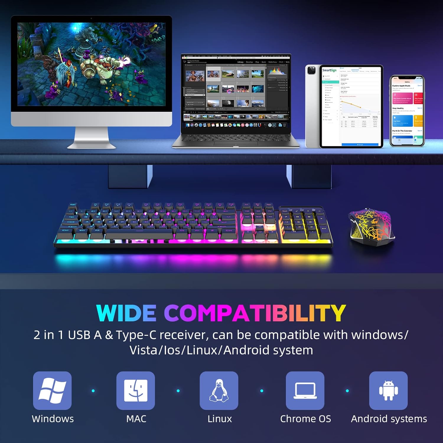 • Практичен дизайн и мултимедийни клавиши: плаващ клавиш в игрови стил с разнообразие от мултимедийни клавишни комбинации и двуцветни инжекционни клавиши. Клавиатурата е водоустойчива и лесна за почистване. Богати мултимедийни клавиши, Fn плюс съответните функционални клавиши, лесна и бърза работа.