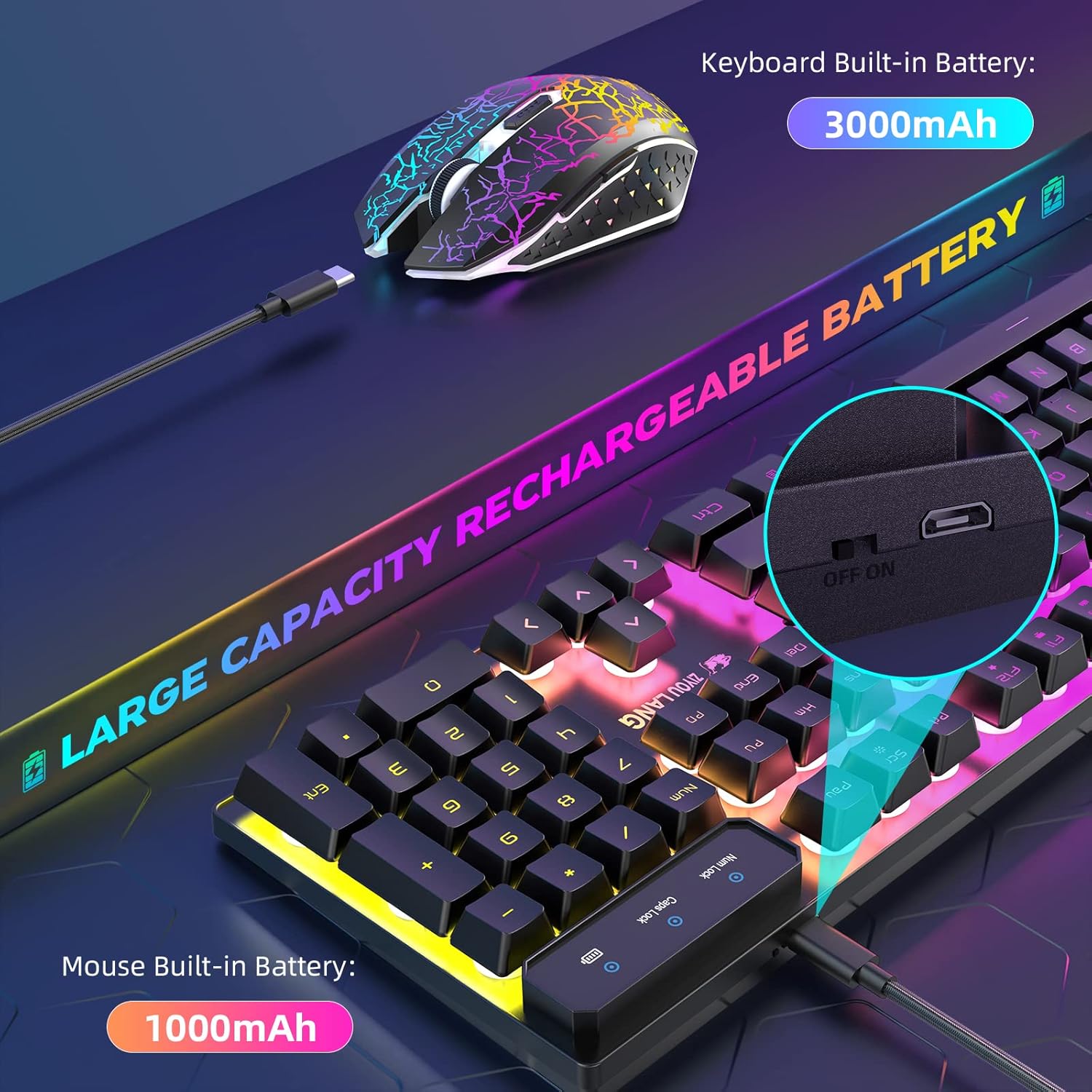 • Комплект акумулаторна клавиатура и мишка: Вградена батерия с голям капацитет, вградена батерия за клавиатура с капацитет 3000mAh, батерия за мишка с капацитет 800mAh, дълъг живот на батерията, избягвайте проблемите с честата смяна на батерията.