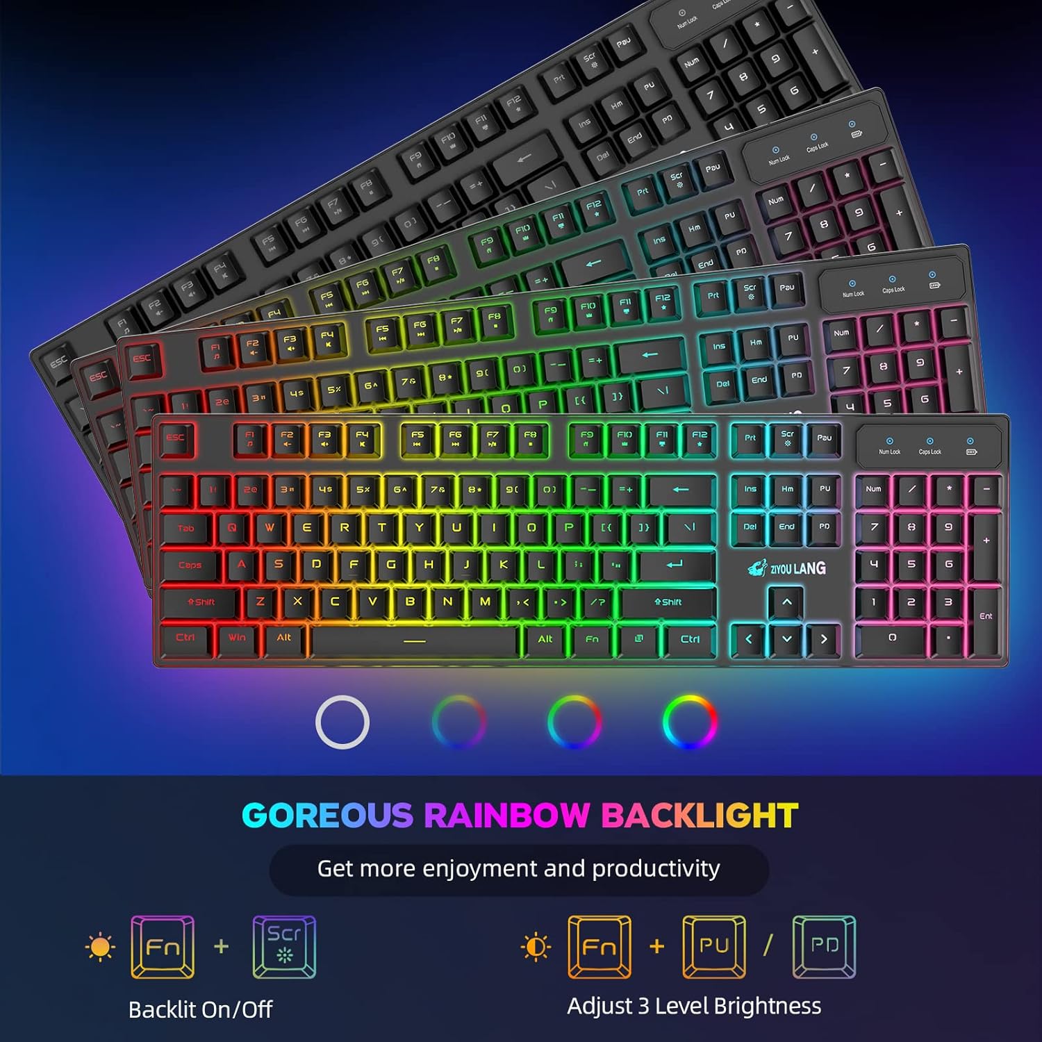 • Невероятна подсветка: Клавиатурата има невероятен ефект на оранжева подсветка. Мишката има различни цветове, които „дишат“ подсветката. Цветът на подсветката на мишката се променя циклично и ви предлага отлично визуално изживяване при работа през нощта. Fn + Scroll Lock: Включване/изключване на подсветката, Fn + PgUp: светлината става по-ярка. Fn + PgDn светлината става по-тъмна.