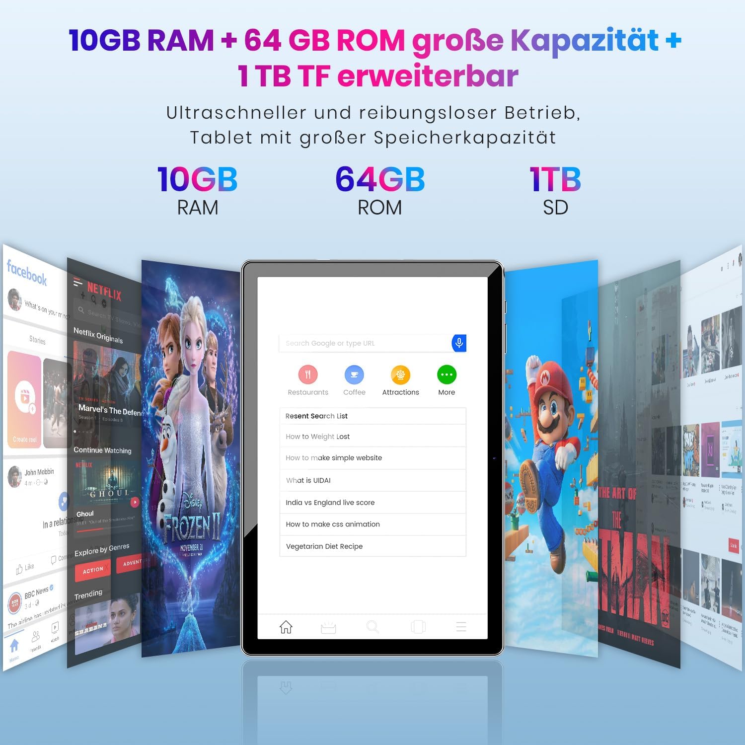 • 1TB памет и бърз Wi-Fi 6: Отговор: Този преносим Android таблет предлага 10GB RAM. Таблетът Android 14 разполага с 64GB вградена памет и до 1024GB разширяема microSD карта за 50% повече място от другите таблети. Поддържа Wi-Fi 6, осигурявайки високоскоростни и стабилни мрежови връзки. Bluetooth 5.0 предлага 30% по-бързи скорости на предаване и комуникационни разстояния от Bluetooth 4.2. Прехвърлянето на снимки, видеоклипове и музика става по-лесно и по-бързо.