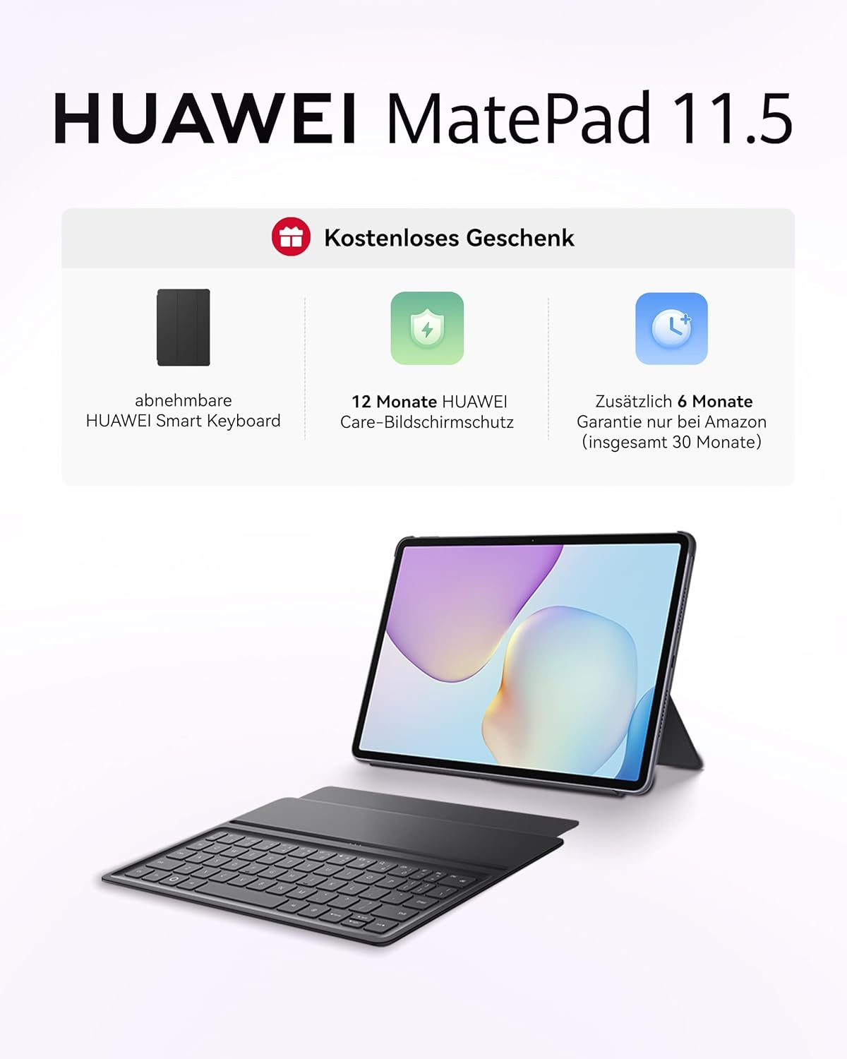 Таблет HUAWEI MatePad 11.5 инча 2025 с клавиатура, 2.5K 120Hz, дисплей PaperMatte, 8+256GB, батерия 10 100 mAh, до 14 часа възпроизвеждане на видео, 40 W Supercharge, Wi-Fi 6, гейминг, сив