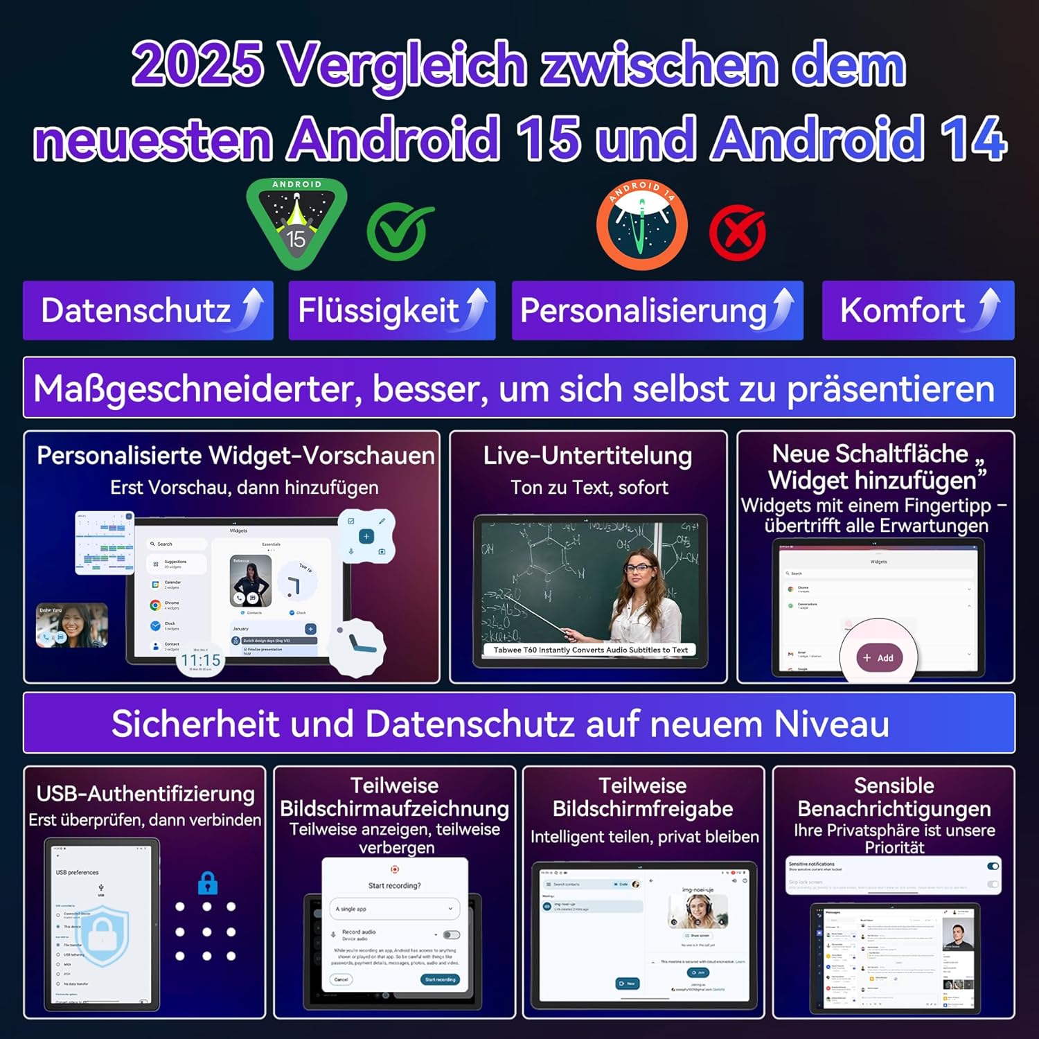 • Таблет с Android 15: По-интелигентен и по-бърз с Gemini AI - 11-инчовият таблет TABWEE T60 Pro с Android 15 предлага интелигентно изживяване с подобрени контроли за поверителност, по-дълъг живот на батерията чрез адаптивна оптимизация и опростени потребителски интерфейси. Захранван от мощния осемядрен процесор Unisoc T7280, той позволява плавна многозадачност и игри без забавяне.