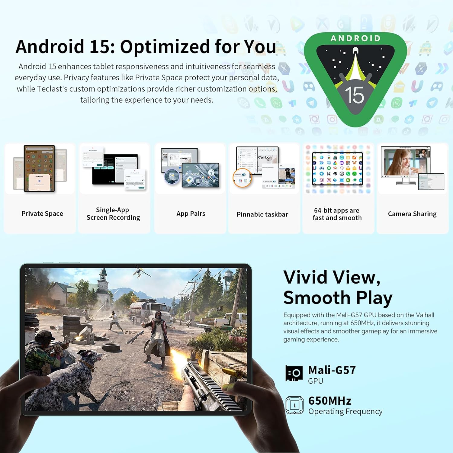 • ????【Таблет с Android 15 + осемядрен процесор + GMS】Таблетът TECLAST P50 с Android 15 разполага с високо персонализируем потребителски интерфейс, съвместимост и оперативна ефективност, които ви помагат да работите и да се забавлявате по-умно. Мощният осемядрен процесор UNISOC T7200 осигурява по-лесен достъп до ежедневни приложения. Той е сертифициран и по GMS, което ви позволява лесно да изтегляте често използван софтуер от магазина.
