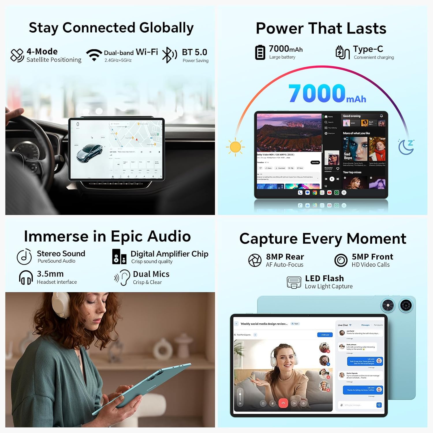 • ????【7000mAh батерия + 2 високоговорителя + GPS】Този Android таблет lte е оборудван с батерия от 7000mAh и предлага 10 часа възпроизвеждане на видео, 12 часа възпроизвеждане на музика и 11 часа сърфиране в интернет, което го прави идеалният спътник за работа и забавление. Два стерео високоговорителя осигуряват по-ясен и по-силен звук. Четирите навигационни режима GPS/BDS/GLONASS/GALILEO го правят чудесен спътник при пътуване и чудесен помощник за любителите на дейности на открито.