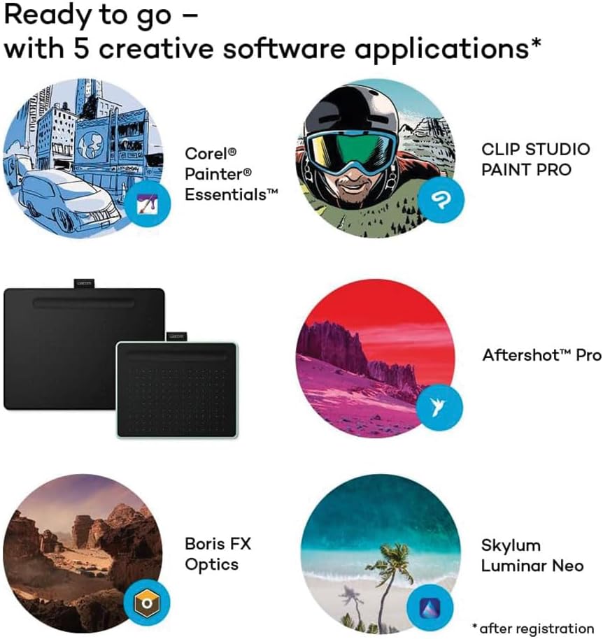 • Обхват на доставката: 1 x таблет Wacom Intuos Medium, черен, за Mac/PC с писалка / 4 софтуерни продукта за творчество: Corel Painter Essentials 8, Corel AfterShot Pro3 (и двата с 90-дневен лиценз), Clip Studio Paint Pro (2-годишен лиценз), Boris FX Optics (1-годишен лиценз)