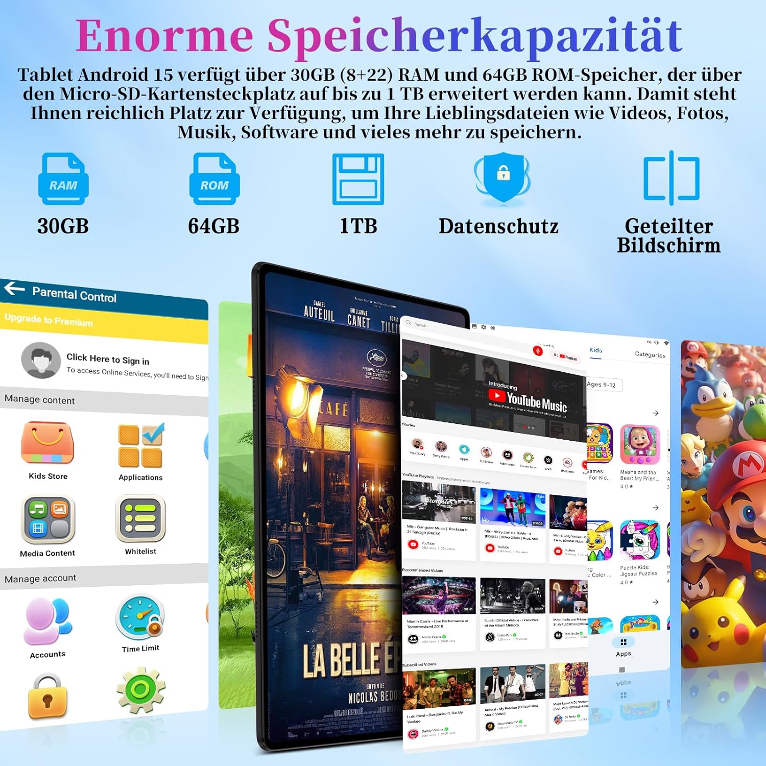 • ????Dual-Lautsprecher + Augenschutzmodus + GPS: Tablet unterstützt A-GPS/GPS/BeiDou für eine präzise Positionsbestimmung. Das Android 15-Tablet verfügt außerdem über zwei hochwertige Lautsprecher, die einen klaren, brillanten Klang für ein beeindruckendes audiovisuelles Erlebnis liefern. Das 10,1-Zoll-Display unterstützt einen Augenschutzmodus, der blaues Licht filtert und die Farbtemperatur anpasst, um die Augen bei längerer Nutzung zu entlasten. Diese Funktion eignet sich besonders für Schüler.