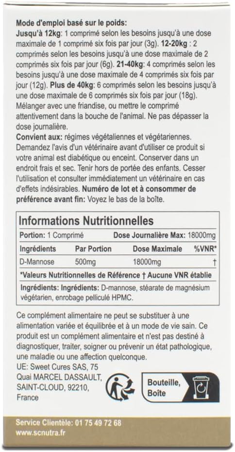 Всяка таблетка съдържа 500 мг чиста D-маноза (вегетариански магнезиев стеарат и HPMC филм по-малко от 0,05 г)