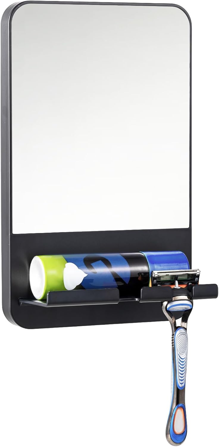 • Долен рафт с 2 държача за ножчета за бръснач: Огледалото има практичен горен рафт, който може да побере до 10 кг и осигурява допълнително място за съхранение на вашите прибори за бръснене. Разполага и с отделна кука за окачване на самобръсначката.