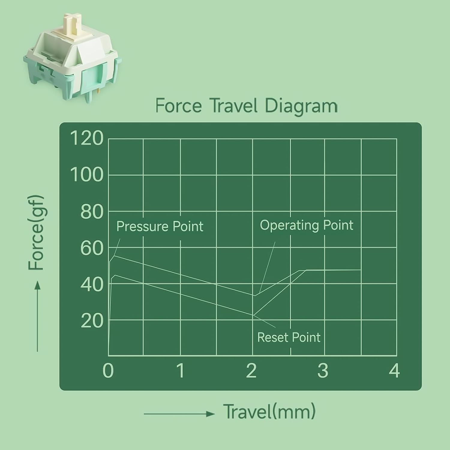 • Чист звуков профил: Превключвателят поддържа класическия и носталгичен пълен ход от 4,0 мм и осигурява характерен дълбок звук, както и приятно тракащ звуков профил върху повечето материали за клавиатури с тънък слой фабрично смазване.