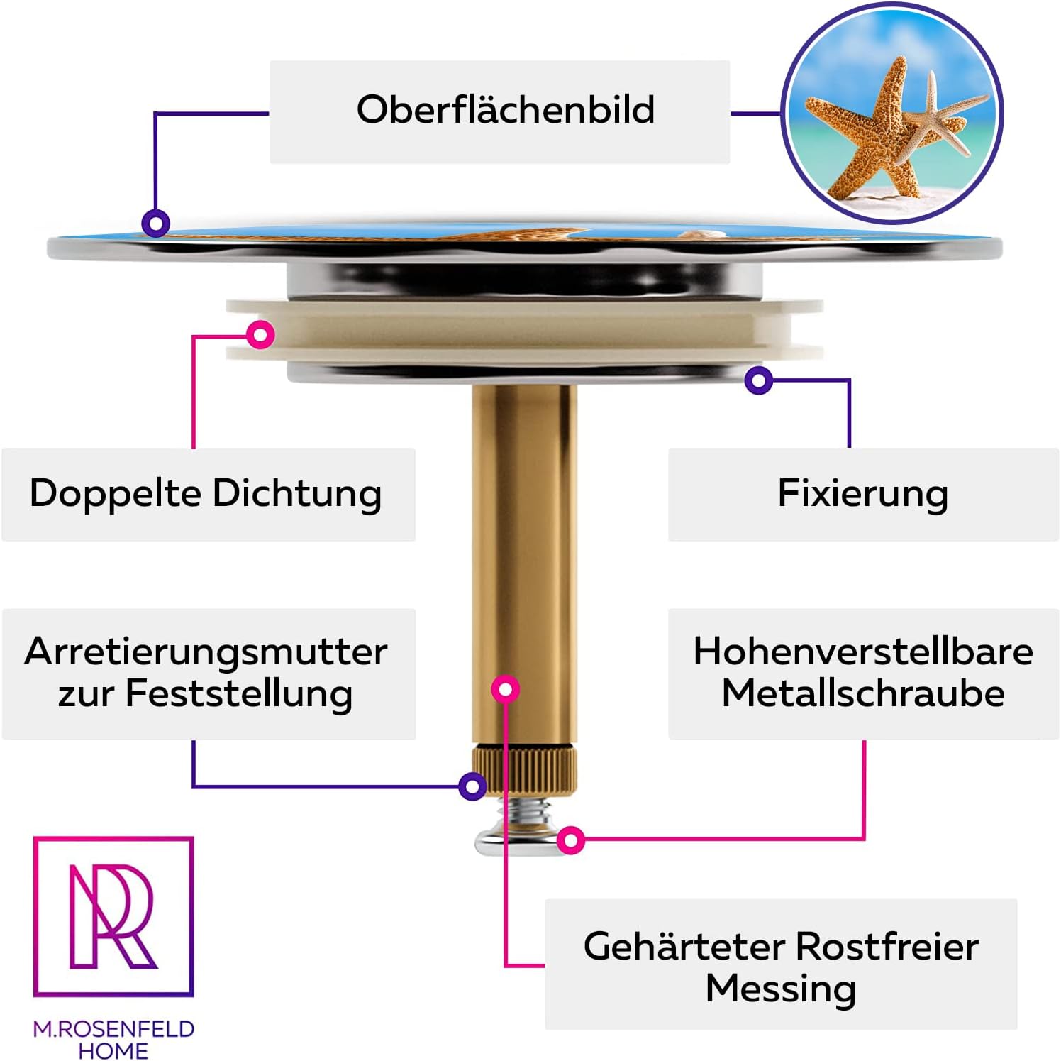 Тапа за вана с мотив морска звезда - Морска звезда - 72 мм Универсална месингова тапа за вана с двойно уплътнение