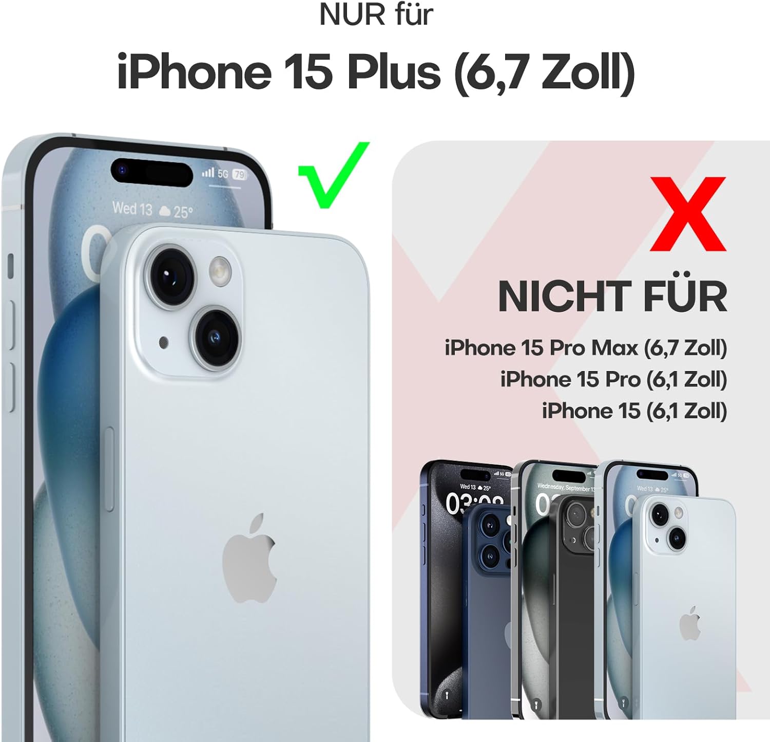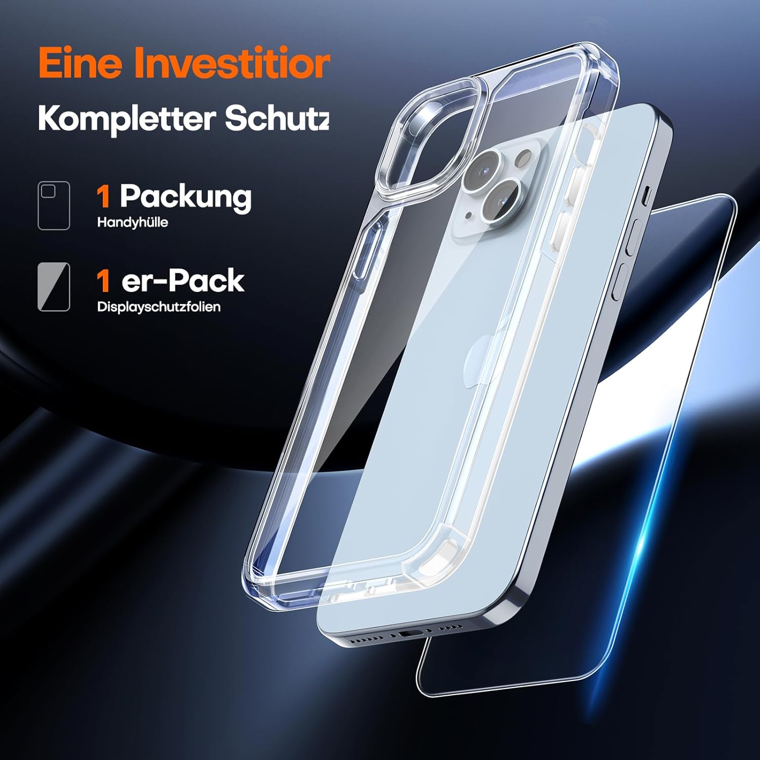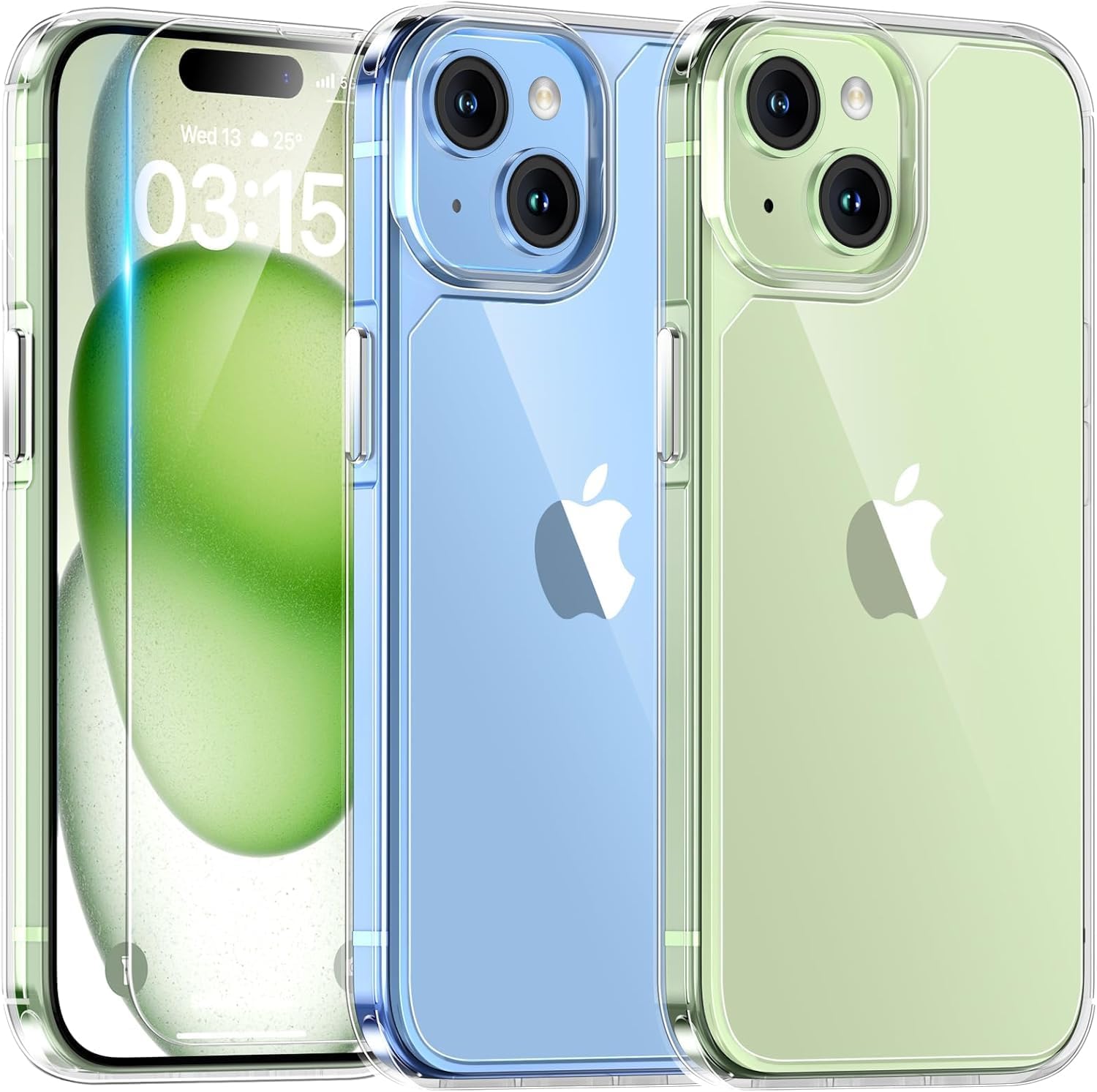 TAURI 5-в-1 калъф за iPhone 15 Plus, 1 калъф за мобилен телефон, 2 протектора за екран и 2 протектора за камера, защита от военен клас, против пожълтяване, удароустойчив калъф, 360-градусова защита, прозрачен