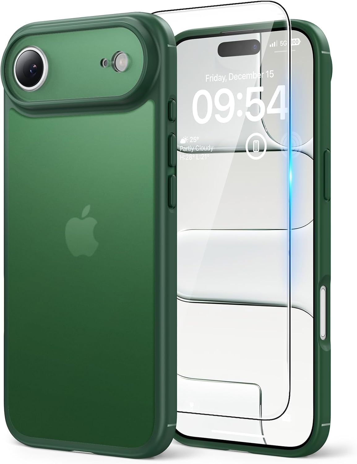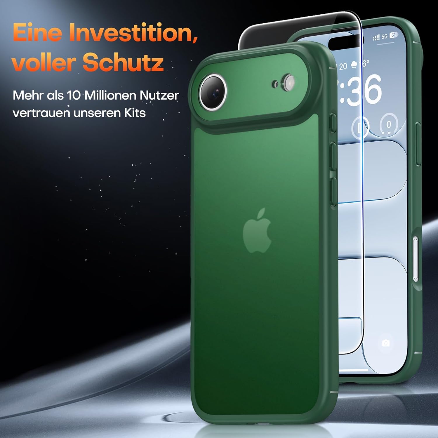 TAURI Калъф за Air 2025 6.6 инча със закалено стъклено фолио, пълна защита на камерата, [против пожълтяване] Удароустойчив прозрачен калъф за мобилен телефон по военен стандарт - матово планинско зелено