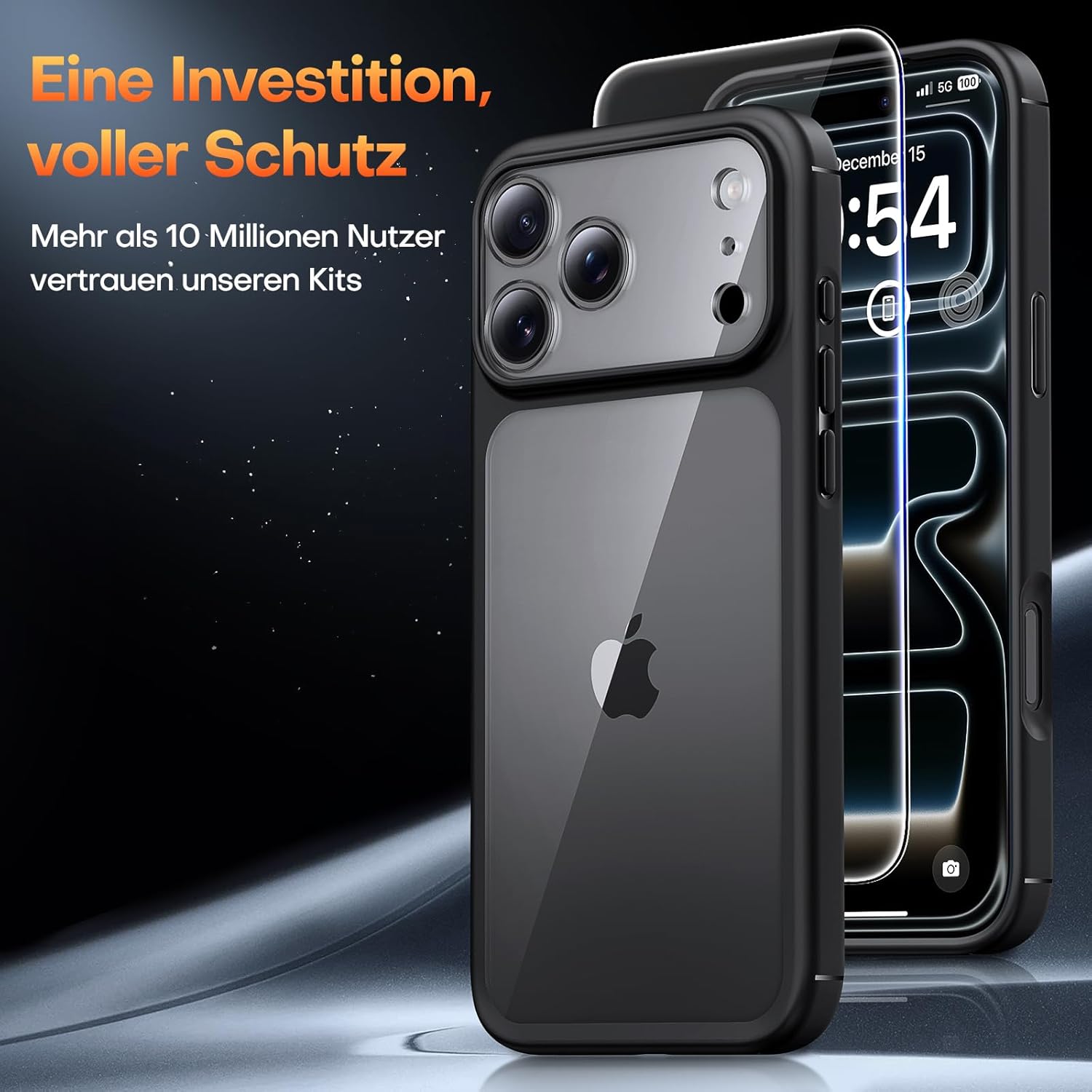 • 2 в 1, 360° цялостна защита: Този удароустойчив комплект за iPhone 17 Pro, включващ висококачествено закалено стъкло 9H, предпазва екрана на телефона ви от надрасквания и счупване, като същевременно остава ултратънък и предлага приятно и чувствително усещане при допир, сякаш няма защита.