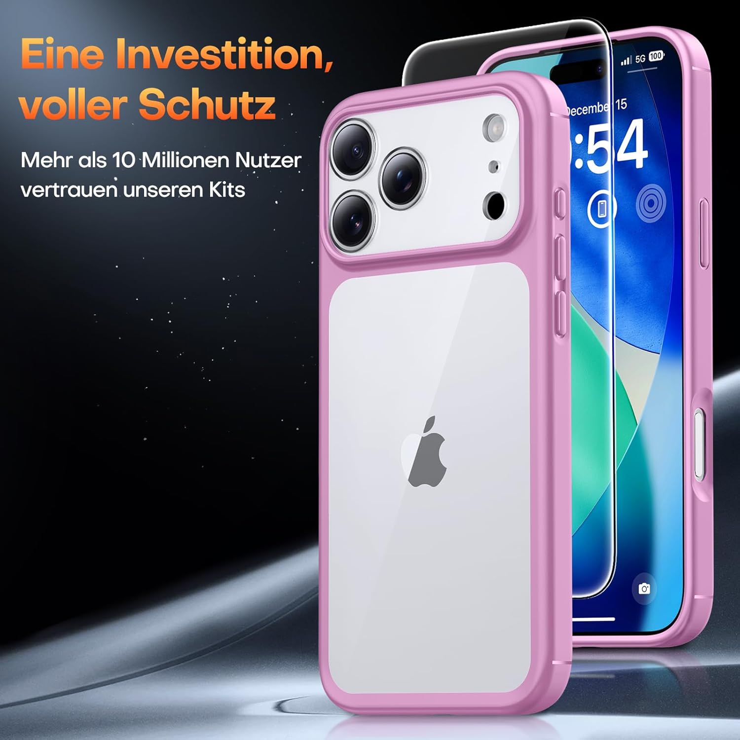 TAURI калъф за Pro 2025 6.3 инча със закалено стъклено фолио, пълна защита на камерата, [против пожълтяване] удароустойчив прозрачен калъф за мобилен телефон, военен стандарт - розов