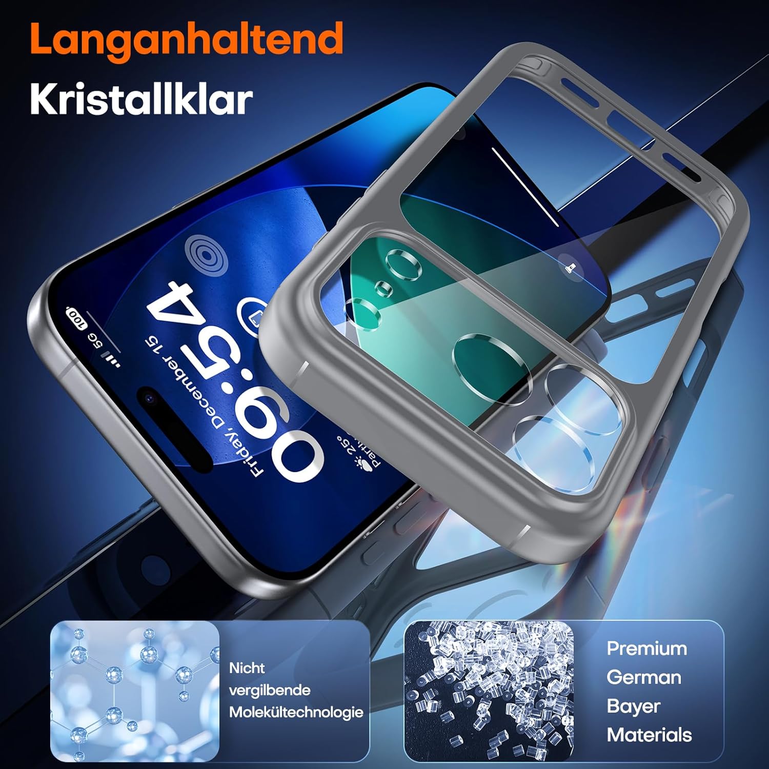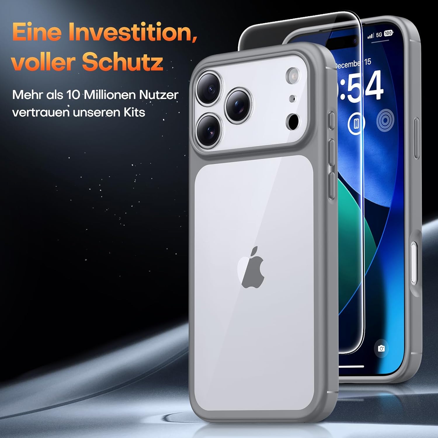 • 2 в 1, 360° цялостна защита: Този удароустойчив комплект за iPhone 17 Pro, включващ висококачествено закалено стъкло 9H, предпазва екрана на телефона ви от надрасквания и счупване, като същевременно остава ултратънък и предлага приятно и чувствително усещане при допир, сякаш няма защита.
