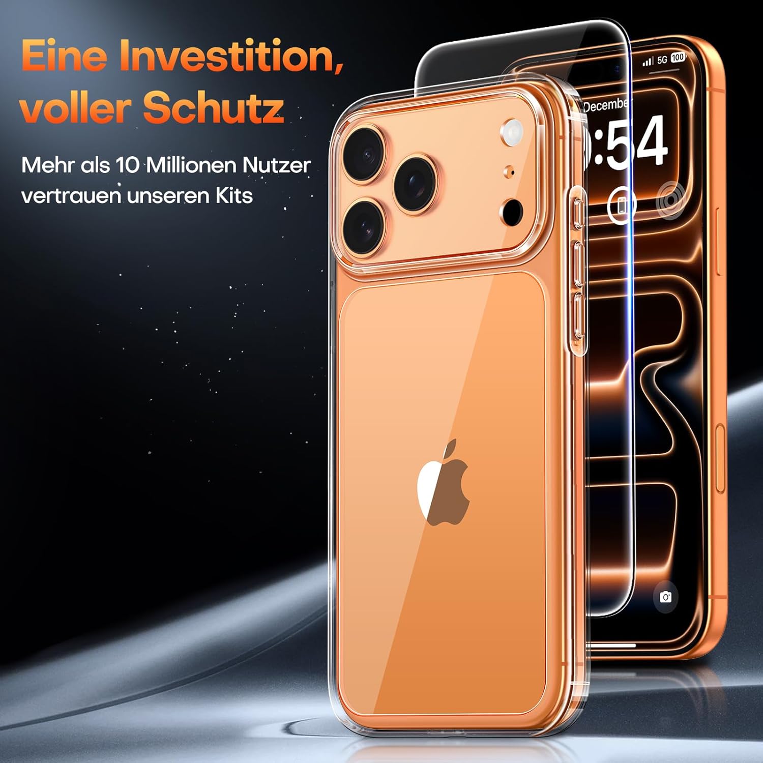 • 2 в 1, 360° цялостна защита: Този удароустойчив комплект за iPhone 17 Pro, включващ висококачествено закалено стъкло 9H, предпазва екрана на телефона ви от надрасквания и счупване, като същевременно остава ултратънък и предлага приятно и чувствително усещане при допир, сякаш няма защита.